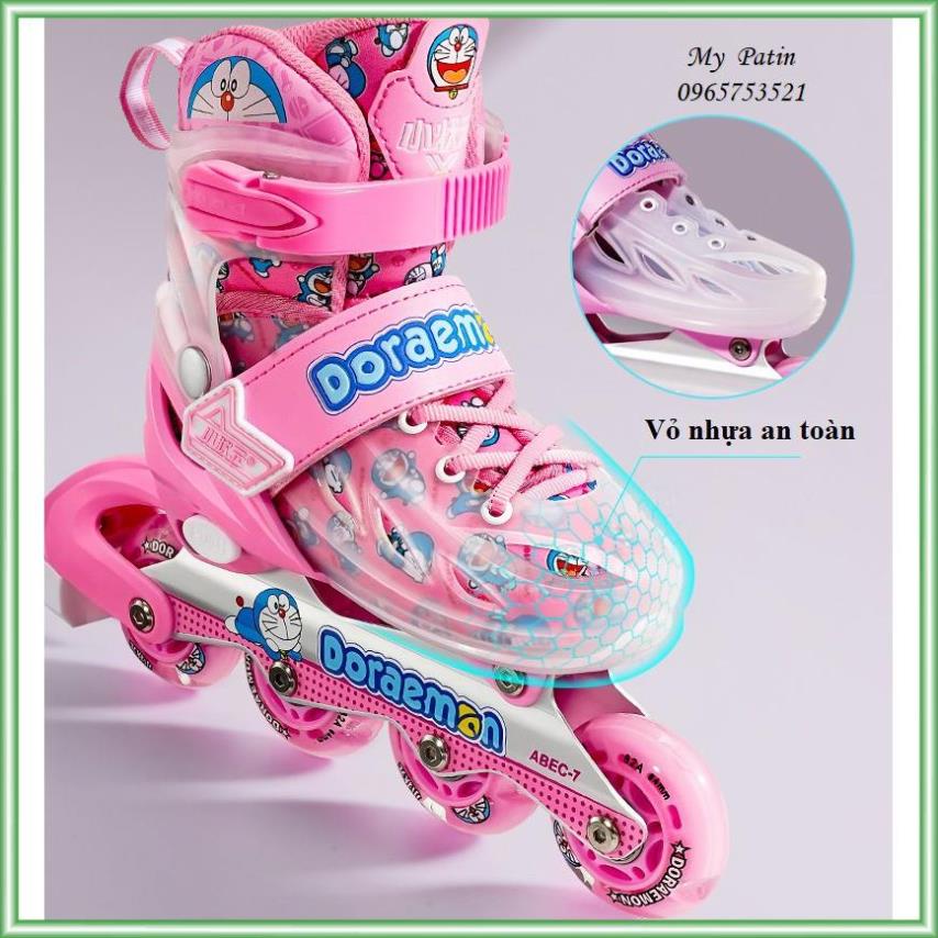 Giới thiệu Giày Trượt Patin Trẻ Em Doremon chính hãng kèm bảo hộ, 8 bánh phát sáng, bánh cao su, màu xanh và hồng