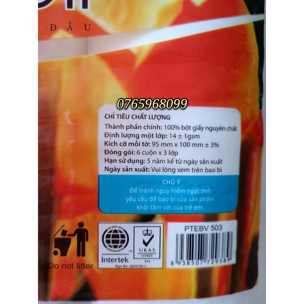 CAM KẾT CHÍNH HÃNG 100% Sản xuất tại Việt Nam Số lớp: 3 lớp Số lượng: 6 cuộn Khổ giấy: 9.5cm x 10cm Lõi giấy: Không lõi Chất liệu 100% bột giấy nguyên chất HSD 5 năm kể từ ngày sản xuất