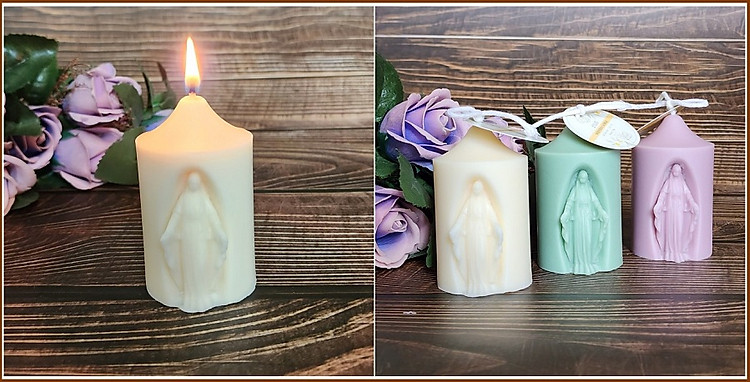*Nến thơm Đức Mẹ Maria ( Random màu ) : Thành phần thiên nhiên từ sáp ong và tinh dầu. Sử dụng thắp sáng, trang trí