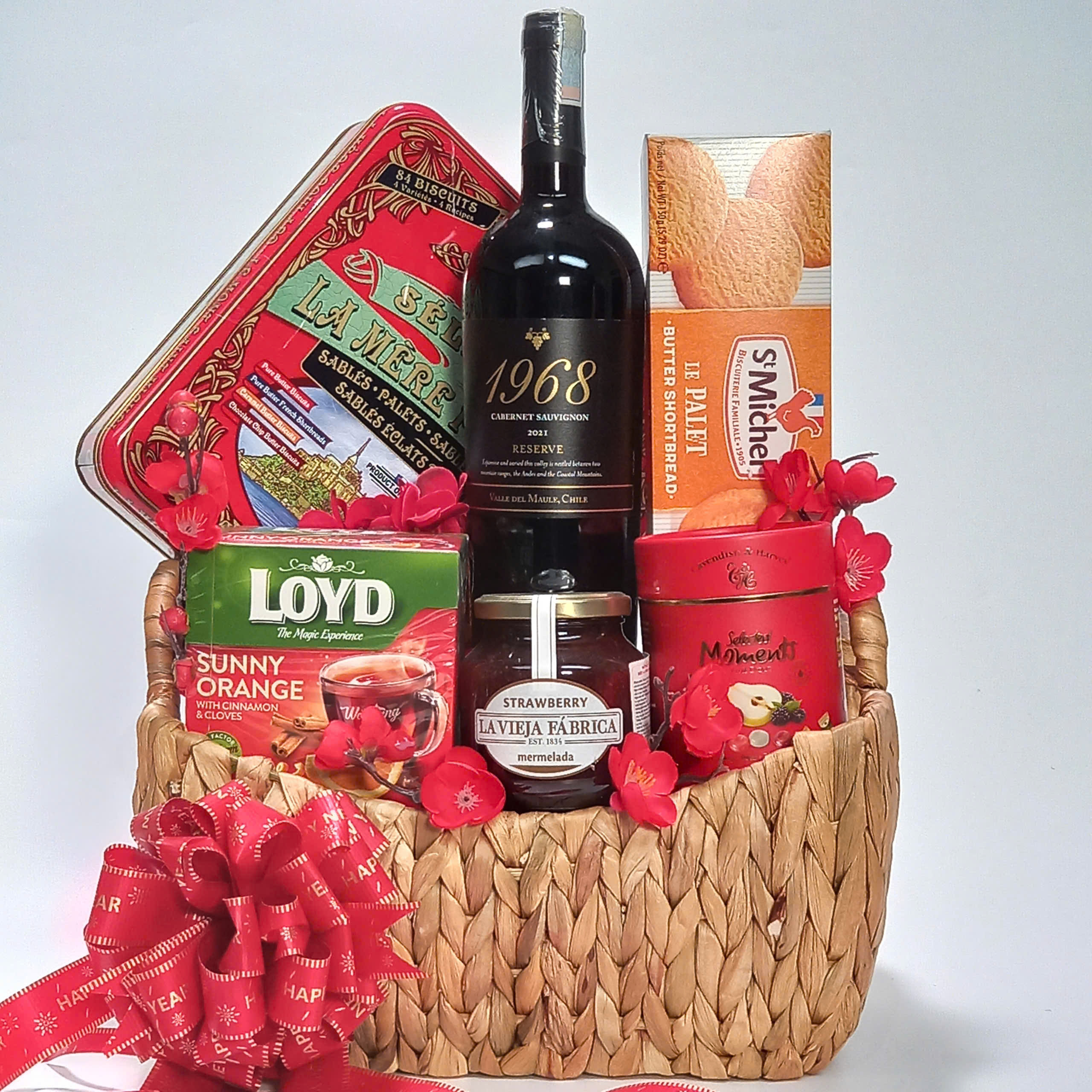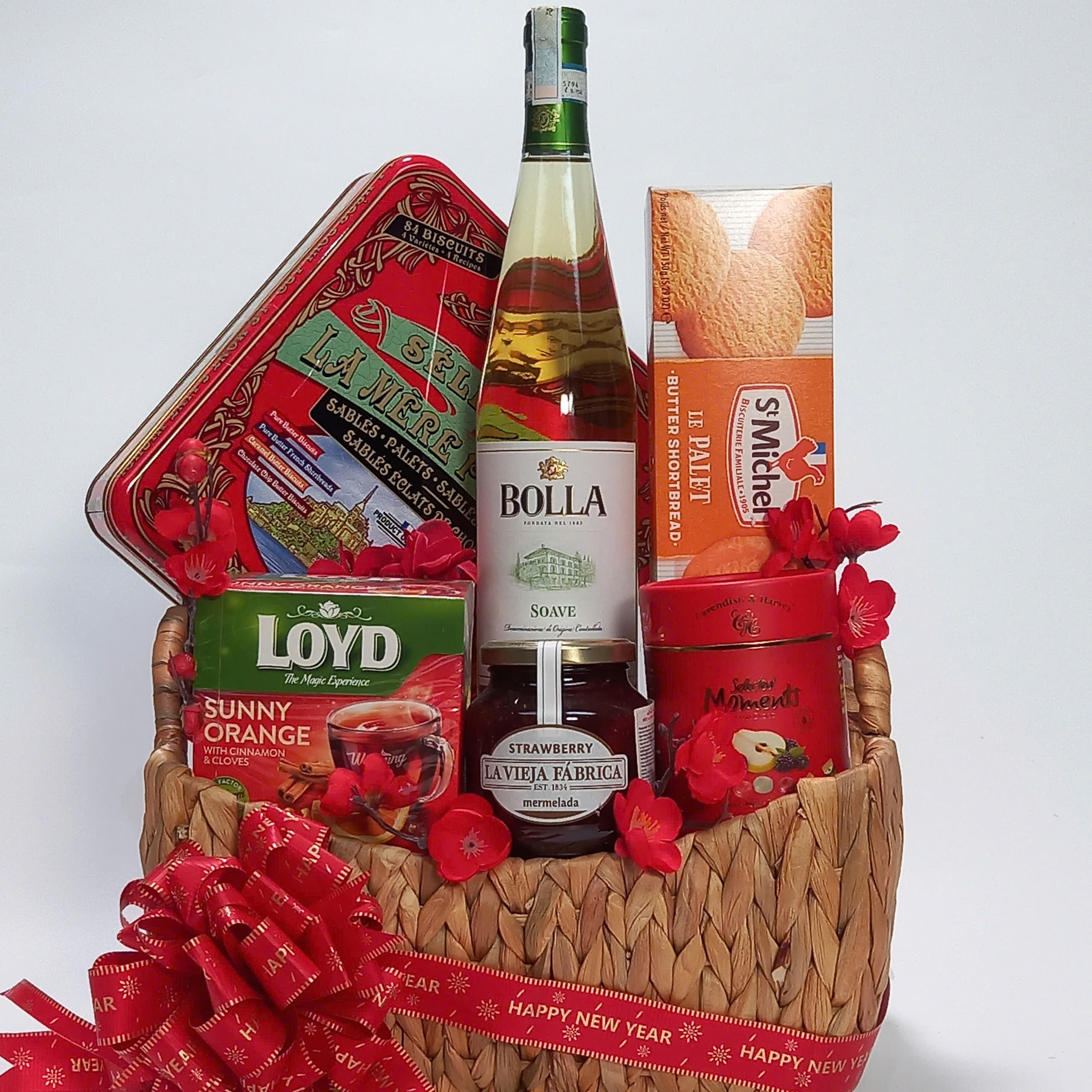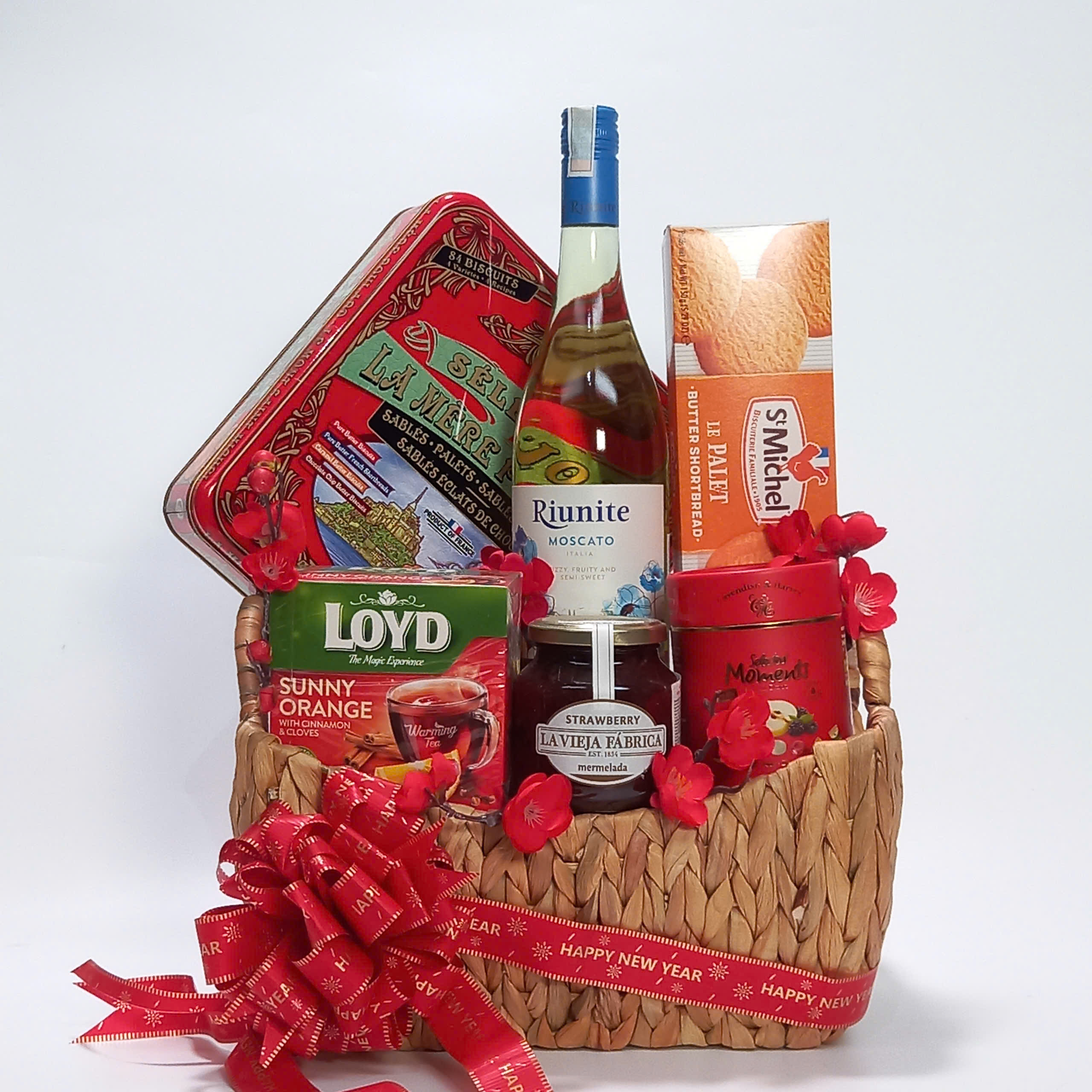 Thành phần | + Rượu vang nhập khẩu: Nhà bán hàng cam kế: 100% nhập khẩu, 100% hàng chính hãng , 100% là hàng thật( sản phẩm nhập khẩu, không đóng chai trong nước)+Trà LOYD 40g sunny orangeTrà cao cấp Ba Lan đậm vị thơm từ trái cam mọng nước.Xuất xứ: Ba LanQuy cách đóng gói: Hộp gồm 20 túi trà ( 2g/túi)+Bánh quy- La Mère Poulard - Sablés ESclats De Chocolat(4Varieties) 750gBrand: La Mere PoulardMã sản phẩm:BMP0803-303Xuất xứ: PhápQuy cách đóng gói: 750g+ Kẹo C&H Selected Moments (Red) 100gVị Cherry, Pear, Blackberry)Brand: Cavendish & HarveyMã sản phẩm: Candy-TB61837RXuất xứ: ĐứcQuy cách đóng gói: 100g+Giỏ lục bình cao cấp Sài Gòn GourmetBrand: Sài Gòn GourmetMã sản phẩm: GLBSGGM02Xuất xứ: Việt Nam+ Bánh qui bơ ST Michel Palets 150g Brand:ST MichelMã sản phẩm:F122051Xuất xứ: PhápQuy cách đóng gói: Hộp 150g+ MỨT DÂU TÂY LA VIEJA FÁBRICA 350grBrand:La Vieja FábricaMã sản phẩm: FRA05012Xuất xứ: Tây Ban NhaQuy cách đóng gói: Hộp 350g+ Hoa trang trí, nơ, thiệp chúc tết |