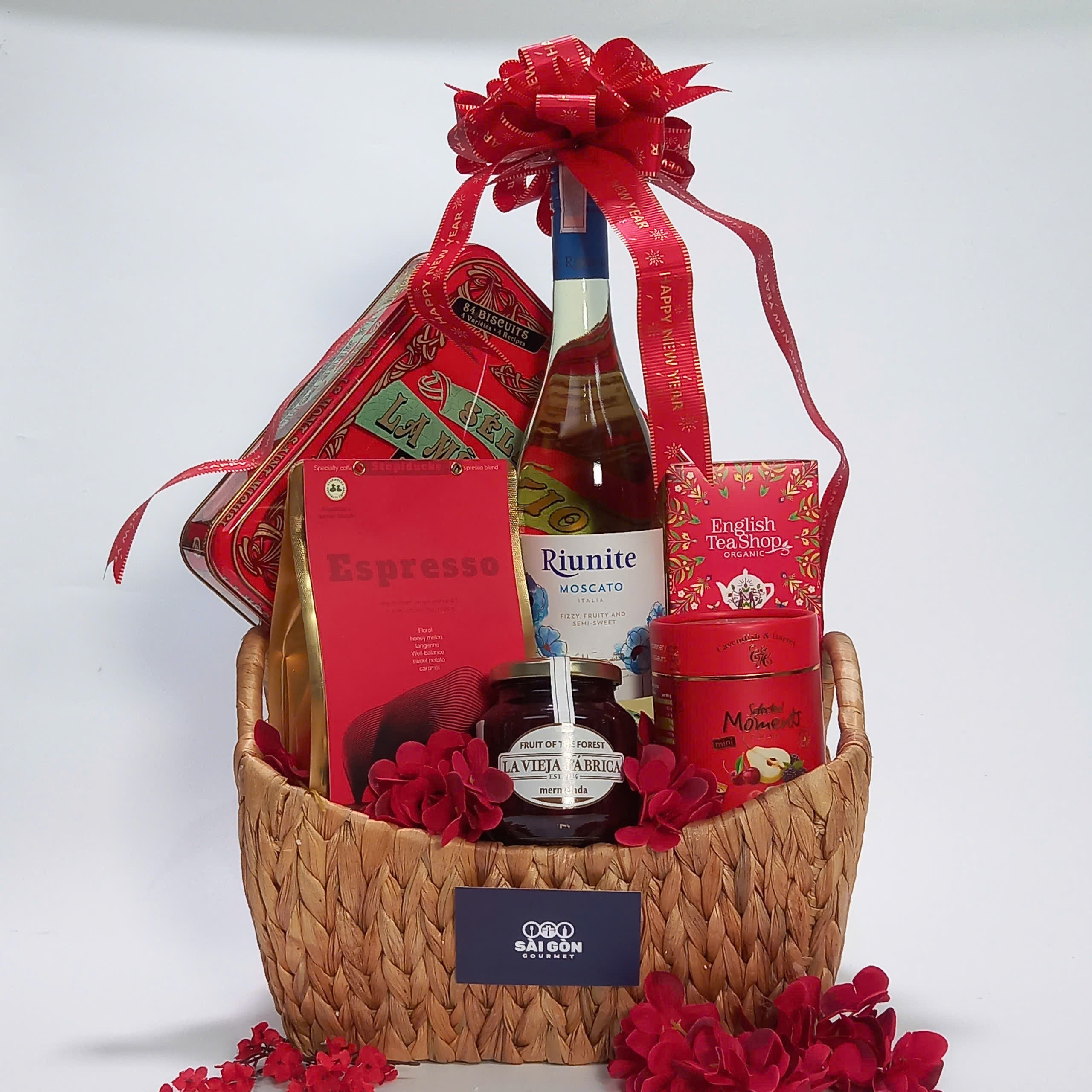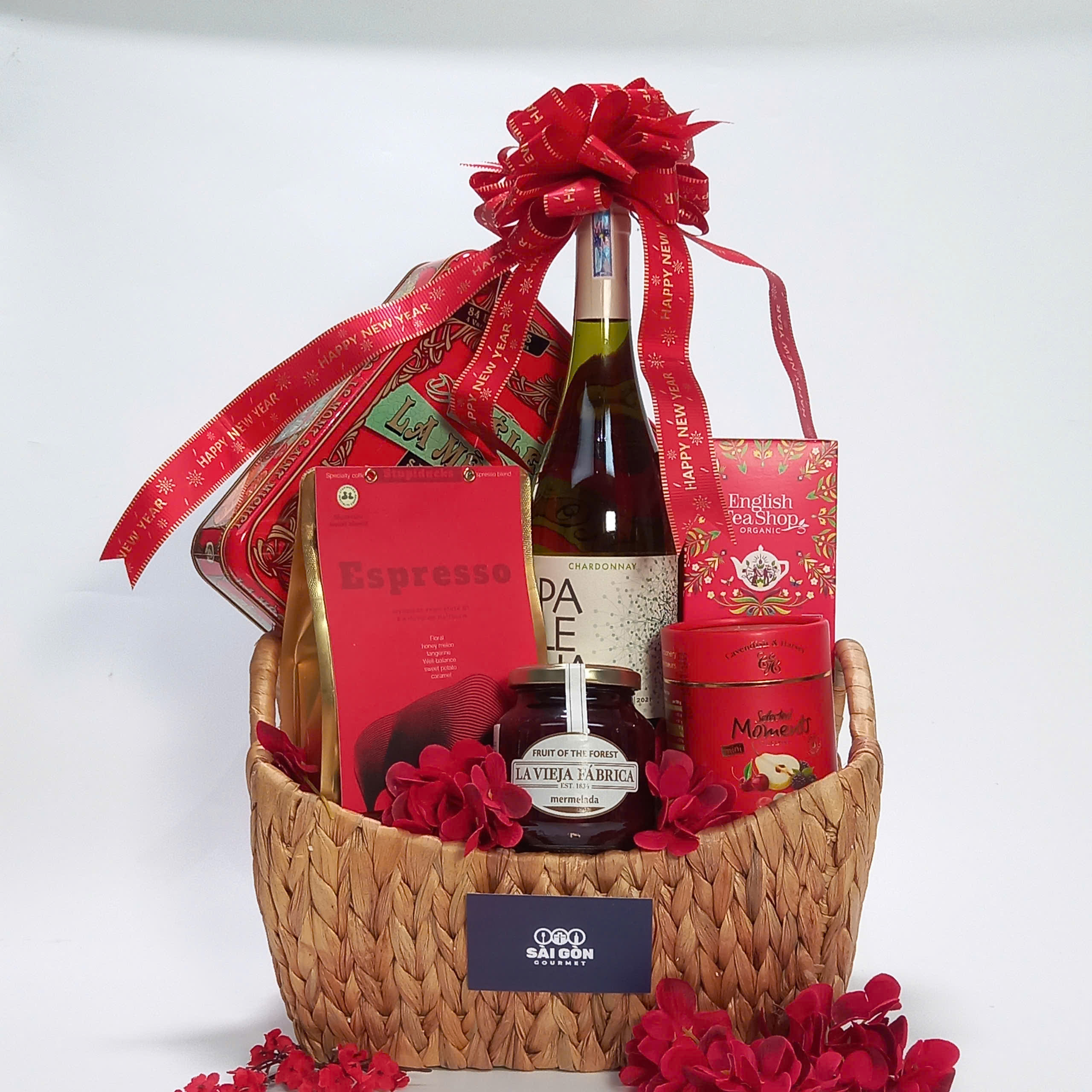 Thành phần | Giỏ quà Sài Gòn Gourmet này được trao tới người nhận với các sản phẩm:+Bánh quy- La Mère Poulard - Sablés ESclats De Chocolat(4Varieties) 750gBrand: La Mere PoulardMã sản phẩm:BMP0803-303Xuất xứ: PhápQuy cách đóng gói: 750g+Trà Organic English Breakfast - English Tea Shop - 20 góiBrand:English Tea ShopMã sản phẩm: B130298Xuất xứ: AnhQuy cách đóng gói: Hộp 20 gói+ Rượu vang nhập khẩu:Nhà bán hàng cam kết: 100% hàng nhập khẩu( không đóng chai hay gia công trong nước)+ Kẹo C&H Selected Moments (Red) 100gVị Cherry, Pear, Blackberry)Brand: Cavendish & HarveyMã sản phẩm: Candy-TB61837RXuất xứ: ĐứcQuy cách đóng gói: 100g+Giỏ lục bình cao cấp Sài Gòn GourmetBrand: Sài Gòn GourmetMã sản phẩm: GLBSGGM02Xuất xứ: Việt Nam+CÀ PHÊ HẠT RANG ĐẶC BIỆT -ESPRESSO RED BULL - SPECIATLY COFFEEMã sản phẩm: espresso250Quy cách đóng gói: Hộp 250gQuốc gia: Myamar & EthiopiaSơ chế: washedĐộ cao vùng: Trên 1.600 maslTasting Note: sô cô la đen, hạnh nhân và whisky+ MỨT DÂU TÂY LA VIEJA FÁBRICA 350grBrand:La Vieja FábricaMã sản phẩm: FRA05012Xuất xứ: Tây Ban NhaQuy cách đóng gói: Hộp 350g+ Hoa trang trí, nơ, thiệp chúc tết |