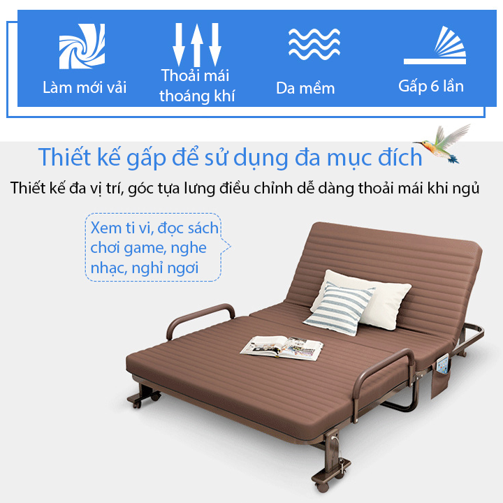 Chân giường có khóa chốt an toàn cố định giường. Vỏ đệm có thể tháo rời, giặt sạch. Đầu giường có thể nâng lên hạ xuống rất tiện dụng trong lúc đọc sách, thư giãn hoặc bệnh nhân trong điều trị được bác sĩ chỉ định nằm cao đầu.Khả năng chuyển đổi nhanh thành ghế sofa giúp tiết kiệm diện tích