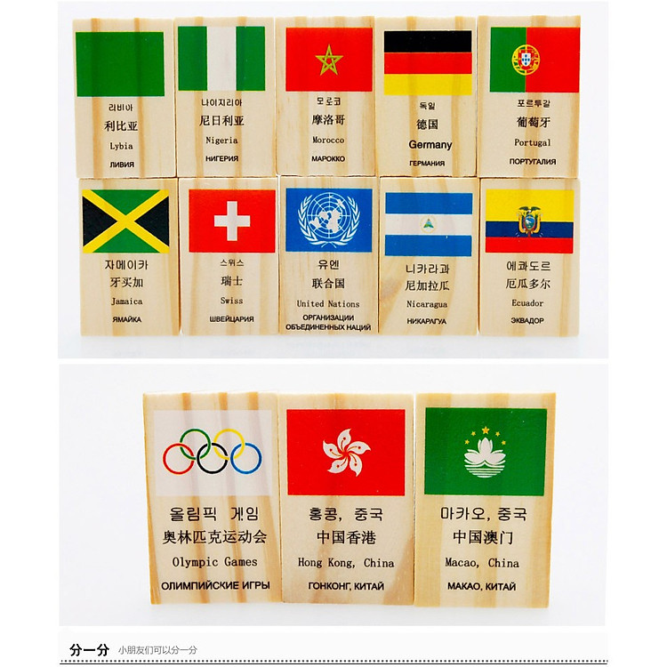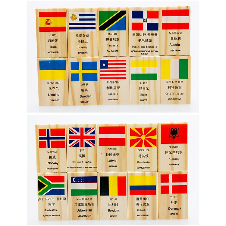 Sản phẩm đồ chơi domino cờ các quốc gia cho bé được làm bằng gỗ bao gồm 100 quân Domino với 99 lá cờ là tên của 99 quốc gia trên thế giới và 1 lá cờ Liên Hợp Quốc.
