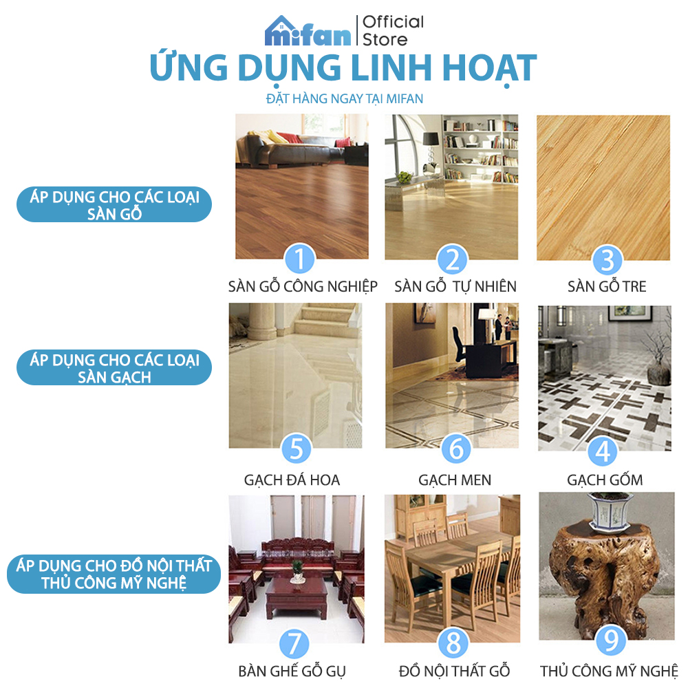 Phạm vi áp dụng: Vệ sinh, làm sạch sàn gỗ, sàn đá, gạch men, bàn ghế gỗ, kệ gỗ…
