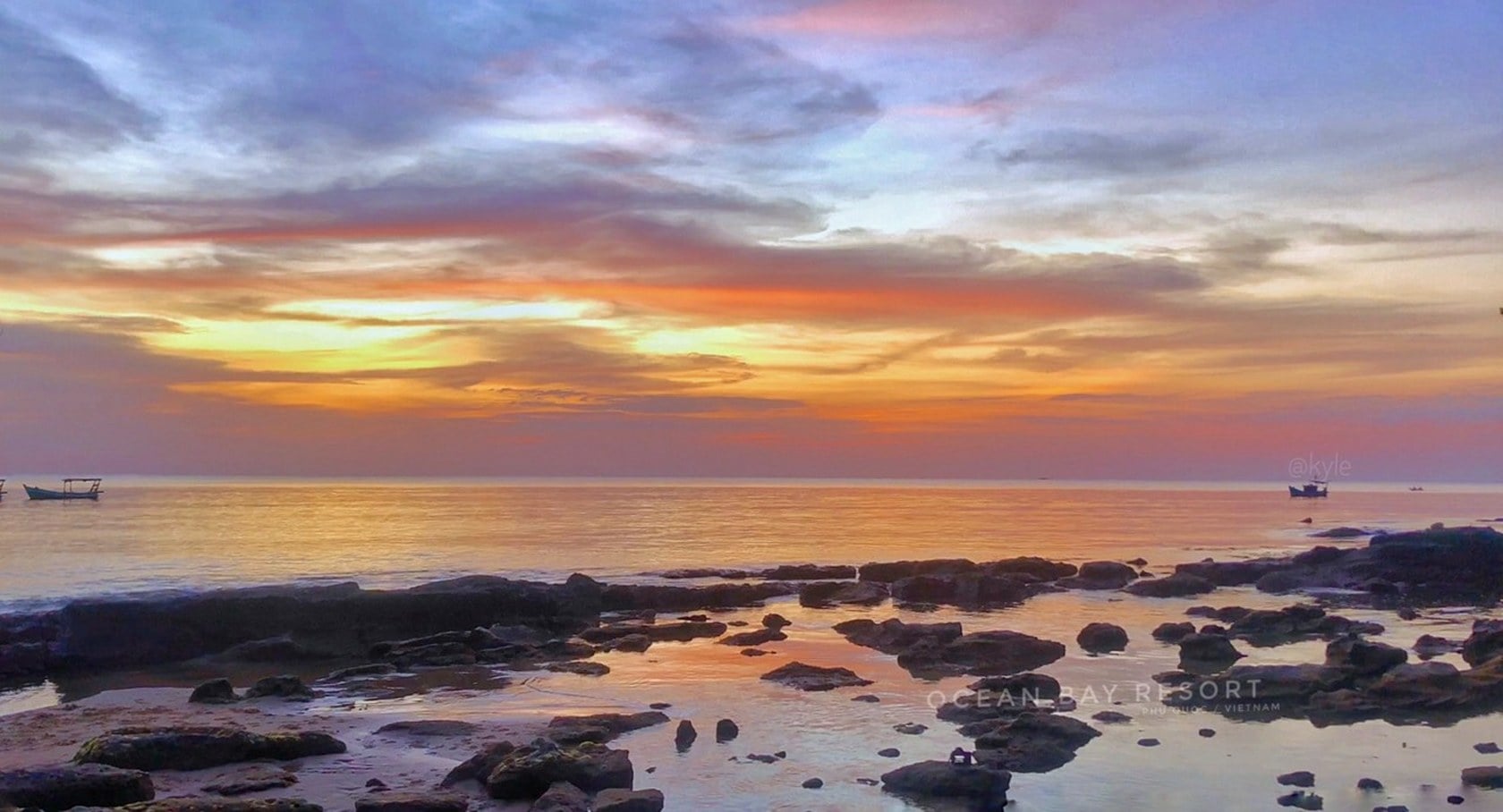 Phía bên cạnh bãi biển Ocean Bay Resort & Spa 5* Phú Quốc là một loạt đá ngầm tạo nên vũ điệu của đá và biển tuyệt đẹp. Chúng tạo nên một tiền cảnh xinh đẹp cho tấm phông màu cam đằng sau.