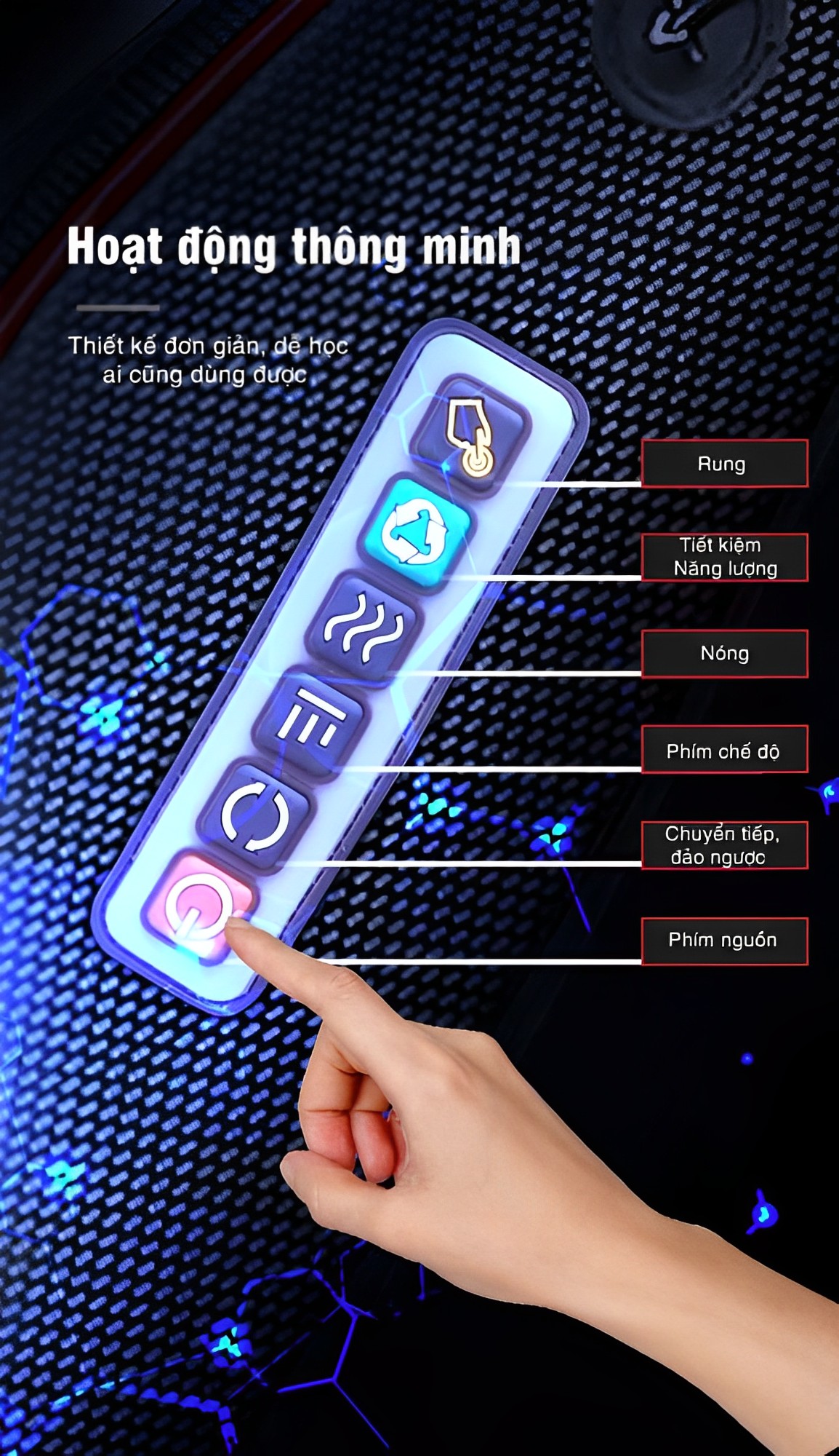 ✓ Bảng điều khiển dễ sử dụng: Bảng điều khiển bên hông máy gồm 6 nút bấm: Rung mát xa, xoay đảo chiều, cường độ Massage, chế độ nhiệt, tiết kiệm năng lượng rất dễ sử dụng, phù hợp cho người già.
