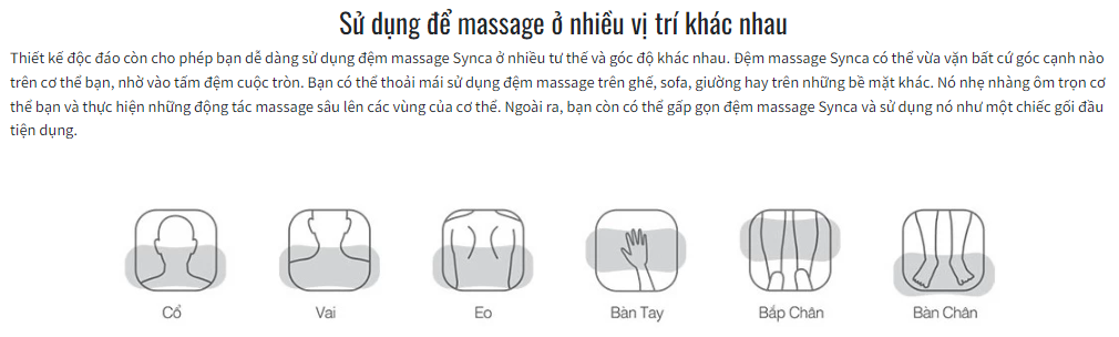 Thiết kế độc đáo còn cho phép bạn dễ dàng sử dụng gối Massage Synca ở nhiều tư thế và góc độ khác nhau. Gối Massage Synca có thể vừa vặn bất cứ góc cạnh nào trên cơ thể bạn, nhờ vào tấm đệm cuộc tròn. Bạn có thể thoải mái sử dụng gối Massage trên ghế, sofa, giường hay trên những bề mặt khác. Nó nhẹ nhàng ôm trọn cơ thể bạn và thực hiện những động tác Massage sâu lên các vùng của cơ thể. Ngoài ra, bạn còn có thể gấp gọn gối Massage Synca và sử dụng nó như một chiếc gối đầu tiện dụng.