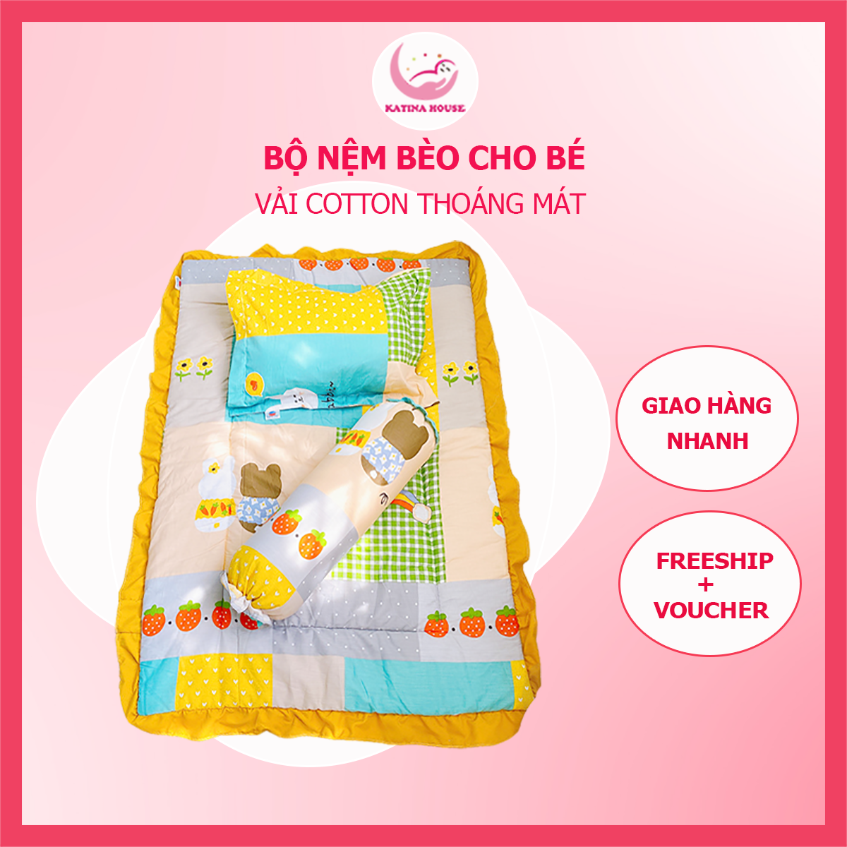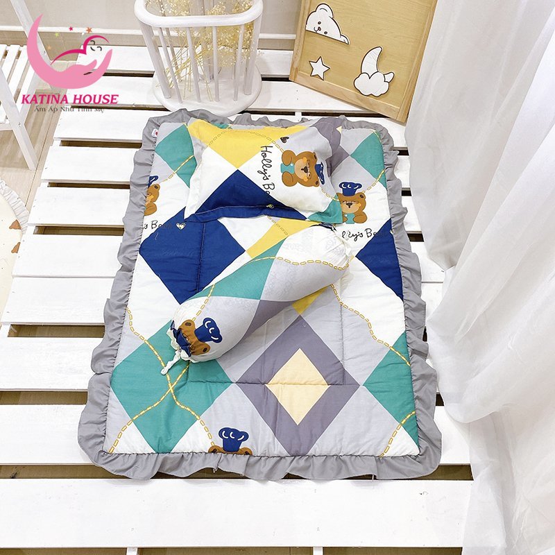 - Bộ Nệm Gối cho bé nhà KATINA HOUSE là dòng sản phẩm cao cấp dành cho bé. Không giống như các loại sản phẩm bông ép khác, Nệm chần gòn được làm từ chất liệu gòn có độ phồng, xốp, mềm mại, tiệt trùng và 100% polyester.