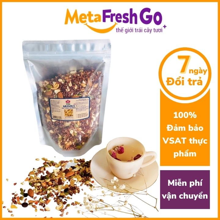 Nhằm đem đến cho khách hàng những trải nghiệm tốt nhất Meta Fresh Go xin cam kết : 👉 100% sản phẩm của cửa hàng đều rõ nguồn gốc xuất xứ, đảm bảo VSAT thực phẩm. 👉 Freeship Xtra đối với tất cả các đơn hàng. 👉 Ship hỏa tốc nội thành Hà Nội trong 2 giờ. 👉 Luôn kiểm tra hàng trước khi giao. 👉 Được đổi trả trong vòng 7 ngày. ---------------------------------------------------------------------- CHI TIẾT SẢN PHẨM Granola Gạo Lứt Trái Cây Ít Calo Hỗ Trợ Giảm Cân