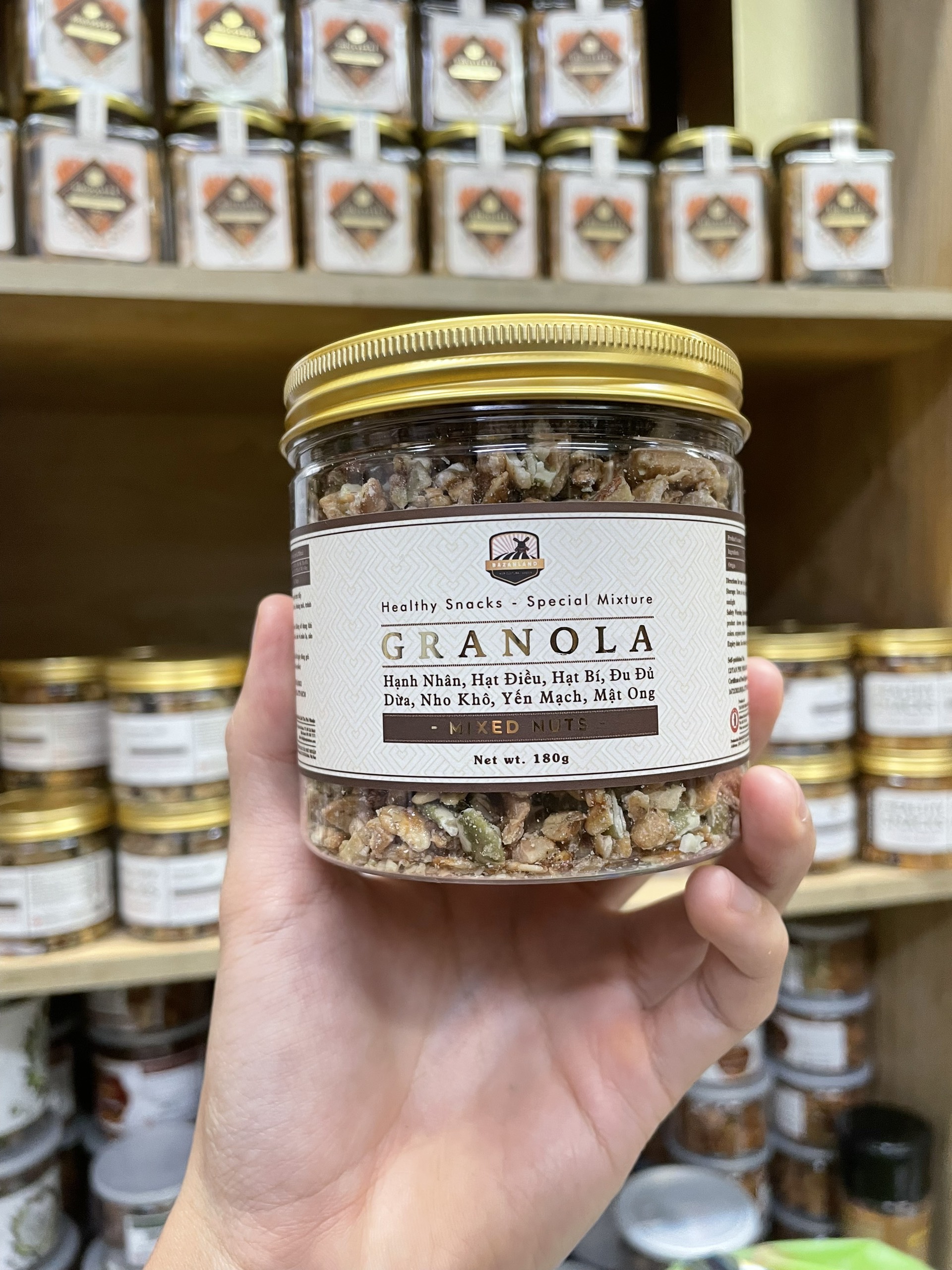 Ngũ cốc - Granola là một loại thực phẩm chứa đựng các thành phần dinh dưỡng được làm từ các nguyên liệu tốt cho sức khỏe. Chứa các thành phần chủ yếu như: hạnh nhân, hạt điều, hạt bí, yến mạch, mật ong, trái cây khô, hạt, Vì vậy, sử dụng ngũ cốc - granola thường xuyên sẽ cung cấp cho cơ thể một hàm lượng lớn các chất dinh dưỡng thiết yếu