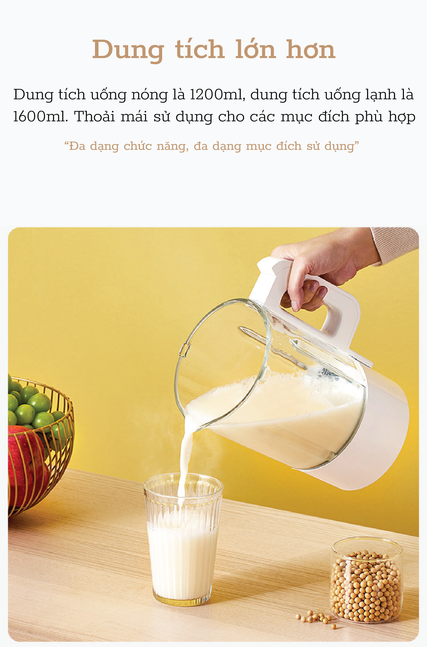 Với dung tích uống nóng lên tới 1200ml, dung tích uống lạnh tới 1600ml, sản phẩm máy nấu sữa hạt DrHomie EH14 chắc chắn sẽ phục vụ vừa đủ các nhu cầu của một hộ gia đình. Một lần nấu cho cả gia đình sử dụng.