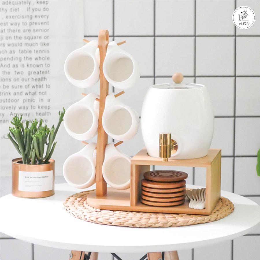 Giới thiệu (Hàng có sẵn) Bộ ấm chum cốc sứ trắng kèm khay gỗ treo phong cách Bắc Âu 20 món