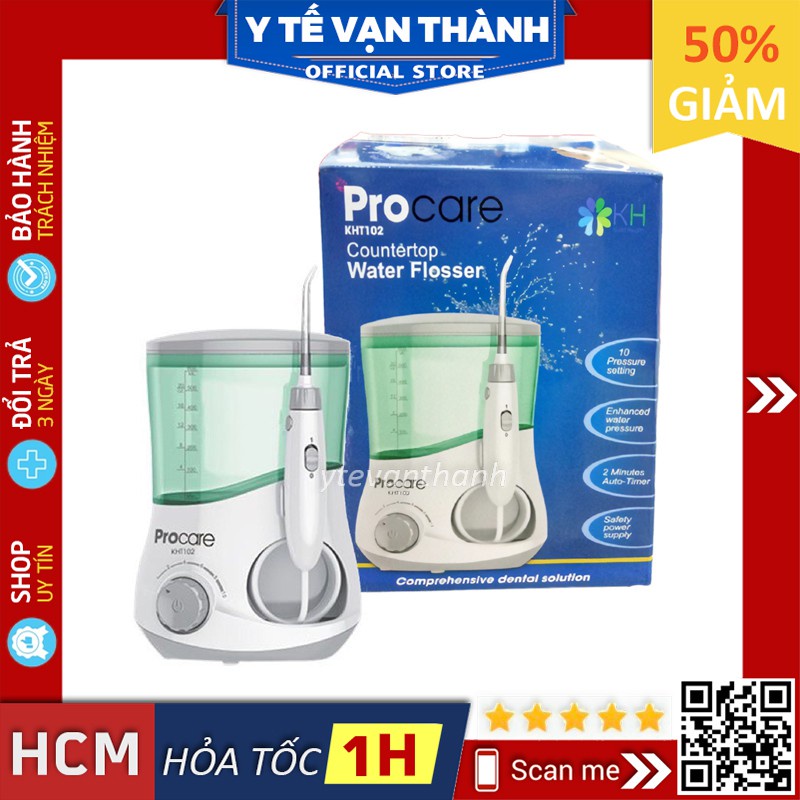 Thương Hiệu: Procare Việt Nam Model: Procare KHT102 Dòng máy: Để Bàn, dung tích bình đựng nước 600 ml Bảo hành: 12 Tháng 👉 Giới thiệu Máy Tăm Nước Để Bàn Procare KHT102 - Máy tăm nước được các bác sỹ nha khoa khuyên dùng bởi hiệu quả làm sạch răng cao hơn so với dùng chỉ nha khoa hay xỉa răng. Giúp giảm mảng bám, chống viêm nướu, chống Viêm lợi và nó thực sự hoàn hảo cho người niềng răng hoặc cấy ghép răng. - Máy tăm nước gia đình Procare KHT102 có 10 chế độ hoạt động tương ứng với 10 cấp độ của áp lực nước. Máy được thiết kế để phù hợp với nhiều lứa tuổi và đối tượng trong gia đình. Procare KHT102 đạt được nhiều chứng nhận về chất lượng của Hoa Kỳ và EU. 👉Ưu điểm của sản phẩm: - Hiệu quả làm sạch đã được chứng minh: loại bỏ 99,9% mảng bám (thức ăn thừa, bựa răng) trong vòng 3 giây - Giúp nướu răng khỏe mạnh hơn: Trong lâm sàng đã chứng minh giúp nướu răng khỏe hơn trên 50% so với việc làm sạch theo phương pháp truyền thống - Lý tưởng cho việc cấy ghép: tăng gấp 2 lần hiệu quả cải thiện sức khỏe nướu xung quanh mô cấy so với việc xỉa răng theo cách truyền thống - Đối với người niềng răng: Loại bỏ các mảng bám và mảnh vụn sâu giữa răng, dưới nướu mà khi đánh răng và dùng chỉ nha khoa truyền thống không thể làm sạch được - Mát-xa và kích thích nướu để tăng cường tuần hoàn giữ nướu của bạn khỏe mạnh 👉 Thông số kỹ thuật của máy: - Với 8 đầu phun nước. - Điều khiển áp suất nước bằng núm vặn 10 mức trên thân máy chính một cách thuận tiện. - Áp suất nước thấp để chùi rửa nhẹ nhàng, áp suất nước cao để chùi rửa sâu - Có nút tạm dừng ngay trên tay cầm - Có ngăn chứa các đầu phun khi không sử dụng - Dung tích bình đựng nước 600 ml. - Áp suất nước từ 10-90 psi. - Điện áp sử dụng: 100-240V 👉 Chế độ bảo hành: - Sản phẩm được bảo hảnh 01 năm - Bảo hành đổi mới trong trong 10 ngày, nếu có trục trặc về kỹ thuật [ Y Tế Vạn Thành (1)]
