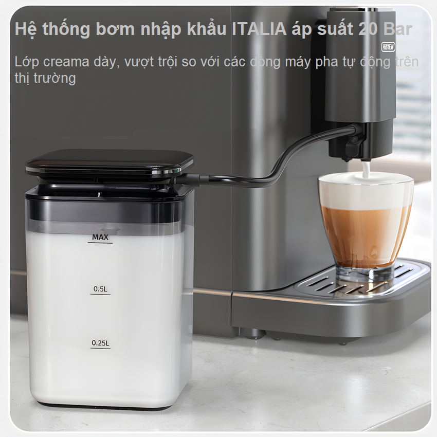 - Hệ thống tạo bọt sữa tự động của máy tạo ra sữa có kết cấu hoàn hảo cho cà phê sữa và cà phê cappuccino, giúp bạn không phải phỏng đoán để đạt được bọt kem và mịn như nhung. Máy đánh sữa tích hợp của HiBREW H16 mang lại kết quả nhất quán, tiết kiệm thời gian và công sức cho người dùng văn phòng muốn thưởng thức đồ uống cà phê đặc biệt mà không gặp rắc rối.