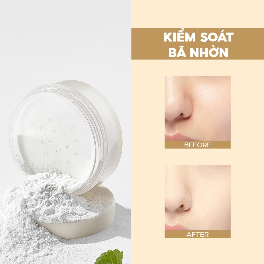 CÔNG DỤNG - Kiểm soát bã nhờn và dầu thừa trên da. - Giữ da luôn khô thoáng, không bóng dầu nhưng vẫn giữ được độ ẩm tự nhiên do da, không khiến da bị khô. - Làm dịu làn da với các hạt phấn chứa tinh chất rau má. - Bảo vệ lớp makeup, hạn chế lớp trang điểm bị khô, bị trôi. - Củng cố độ đàn hồi cho da. Đem lại vẻ ngoài khỏe khoắn, rạng rỡ.