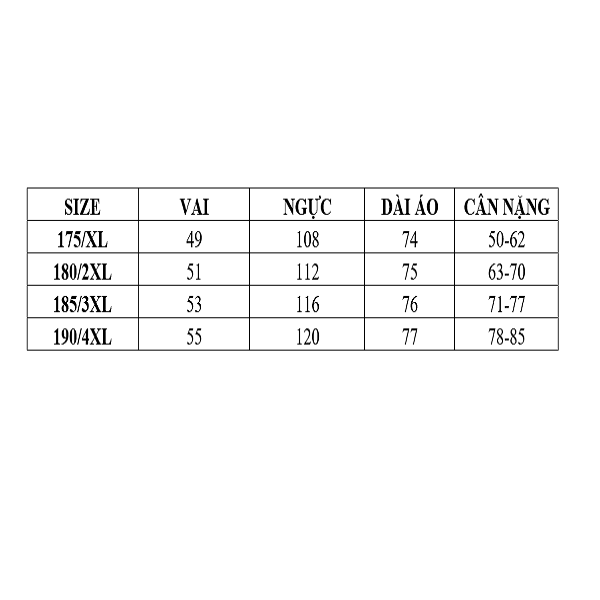 Kích thước: 175/XL(50-62)KG 180/2XL(63-70)KG 185/3XL(71-77)KG 190/4XL(78-85)KG