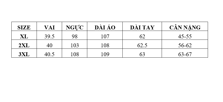 Kích thước: XL(45-55)KG 2XL(56-62)KG 3XL(63-67)KG