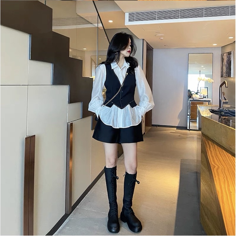 Thời Trang Nữ > Áo > Áo sơ mi || Áo sơ mi trắng dài tay phối gile đen Áo liền không rời