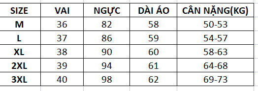 Kích thước: M(50-53)KG L(54-57)KG XL(58-63)KG 2XL(64-68)KG 3XL(69-73)KG