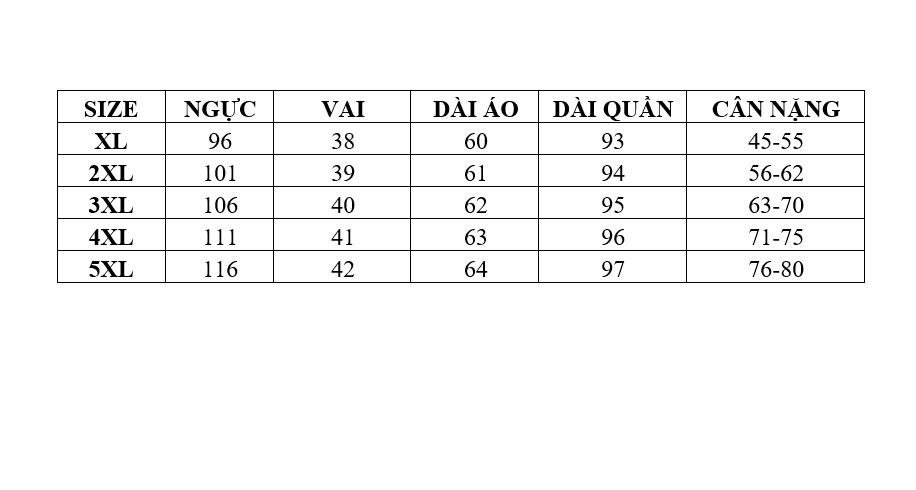 Kích thước: XL(45-55)KG 2XL(56-62)KG 3XL(63-70)KG 4XL(71-75)KG 5XL(76-80)KG