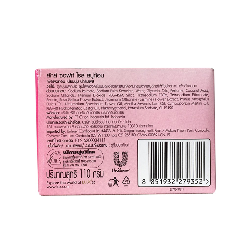 Sản phẩm nhỏ gọn, thiết kế bao bì tinh tế, lãng mạn. Kết cấu mịn màng tạo nhiều bọt làm sạch da, mang lại cảm giác thư thái. Xà Bông Lux Soft Rose 110gr Thái Lan Màu Hồng như một thỏi Massage nhỏ lăn đều khắp cơ thể bạn, kích thích các giác quan mang lại cảm giác dễ chịu và mùi thơm tinh tế với hương thơm tinh tế.