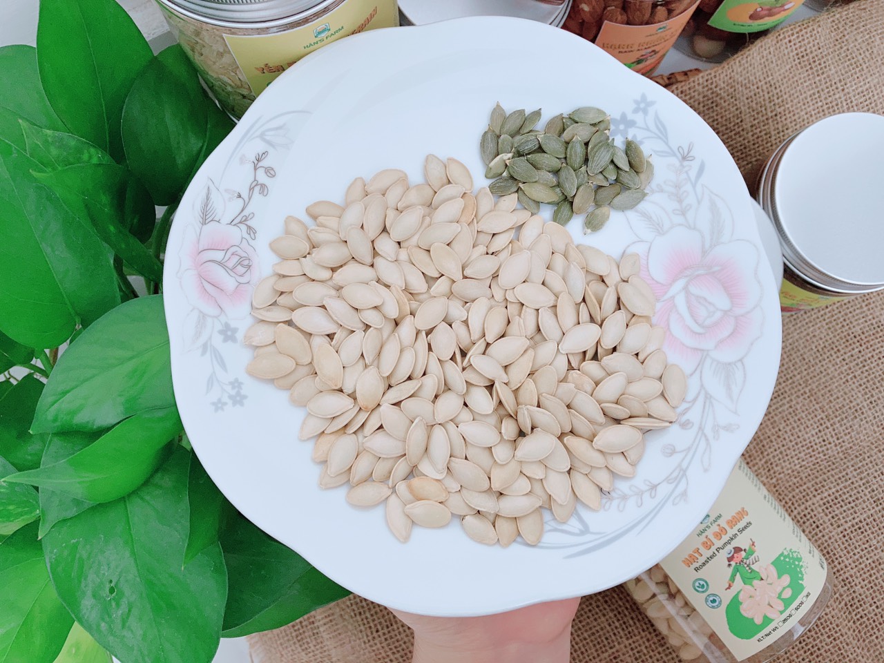 Thành phần | Hạt bí đỏ được Hân's Farm tuyển chọn 100% từ vùng nguyên liệu của người nông dân Bình Thuận. Hạt bí đỏ được chế biến sạch từ khâu tách lấy hạt của những trái bí đỏ, được đem đi rửa sạch, chọn lọc và loại bỏ những hạt lép, sau đó được trộn với muối rồi rang khô tạo thành sản phẩm hạt bí rang chất lượng với hương vị thơm ngon, bùi, béo. |