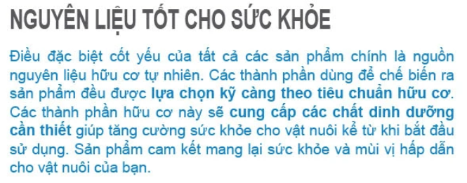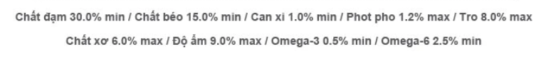 Thành phần | Thịt gà hữu cơ thuỷ phân, Đậu xanh hữu cơ, Hạt hướng dương hữu cơ, Bột đậu nành hữu cơ, Đậu hữu cơ, Khoai lang hữu cơ, Hạt lanh hữu cơ, Lúa mạch hữu cơ, Gạo lứt hữu cơ, Mỡ gà hữu cơ, Methionin, Thịt cá hồi hữu cơ thuỷ phân, Thịt vịt, Taurine, Inulin, Chiết xuất Yuccacshidigera, Muối khô, Fructooligosacarit, Axit Alginic, Yến mạch nguyên hạt hữu cơ, Canxi Phốtphát, Lactobacillus, Hắc mai biển, Hạt anh thảo, Rau mùi, Cà rốt, Rau bina, Vitamin C, Vitamin E, Vitamin A, Vitamin D3, Vitamin B1, Vitamin B2, Vitamin B6, Vitamin B12, Biotin, Axit Pantothenic, Axit Folic, Axit Nicotinic, Fe, Cu, Zn, Se, Mn, Co, I. |