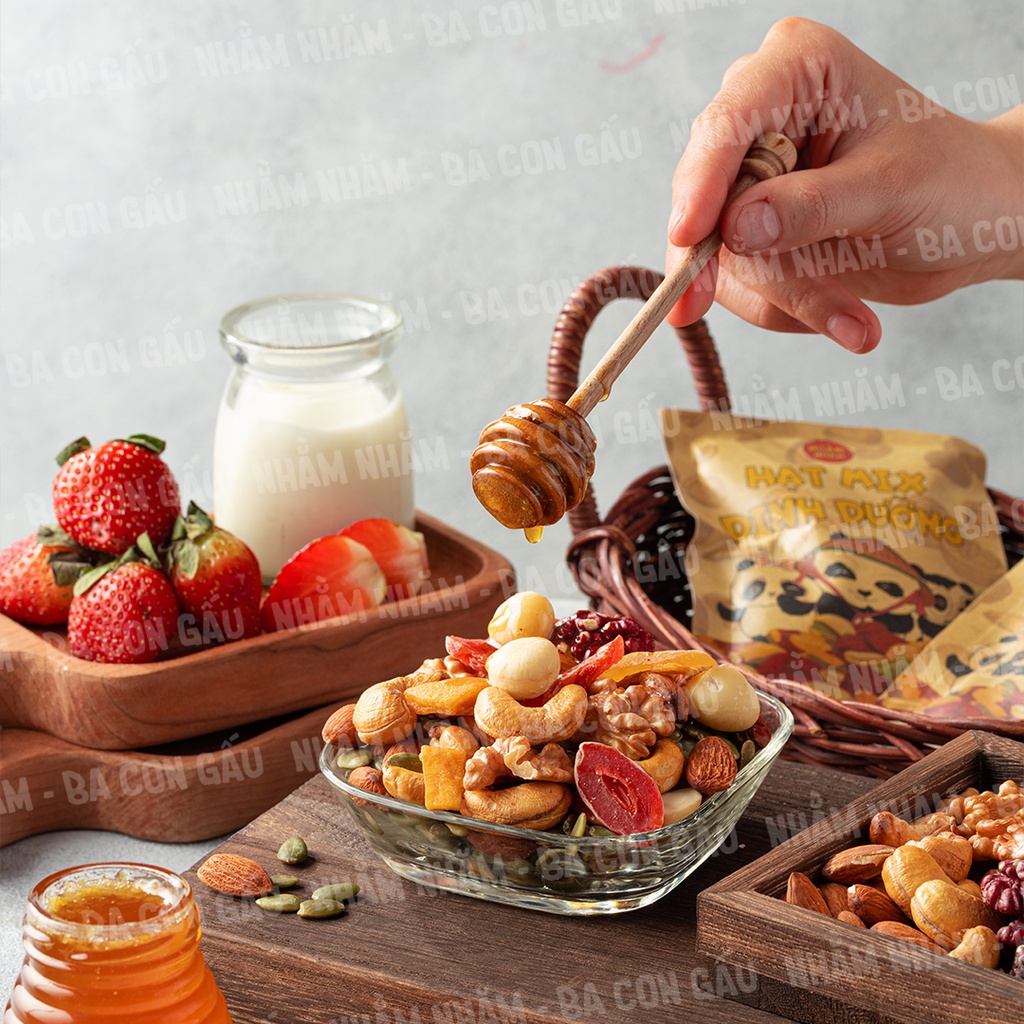 💝 Xin chào Chủ Nhân đến với Nhằm Nhăm ba con gấu 💝 Hạt Mix dinh dưỡng là sản phẩm được chúng em dành tâm huyết rất nhiều từ mong muốn cho Chủ Nhân có một bữa ăn tiện lợi trong những buổi sáng vội vã không kịp chuẩn bị đồ ăn sáng cho chính bản thân mình hoặc cho chồng, con. Cũng có thể là món quà ăn vặt dinh dưỡng mỗi khi cảm thấy thèm ăn, chúng em đã nỗ lực để làm ra sản phẩm tiện lợi nhất nhằm giúp cho Chủ Nhân cảm thấy luôn thuận tiện và thoải mái.