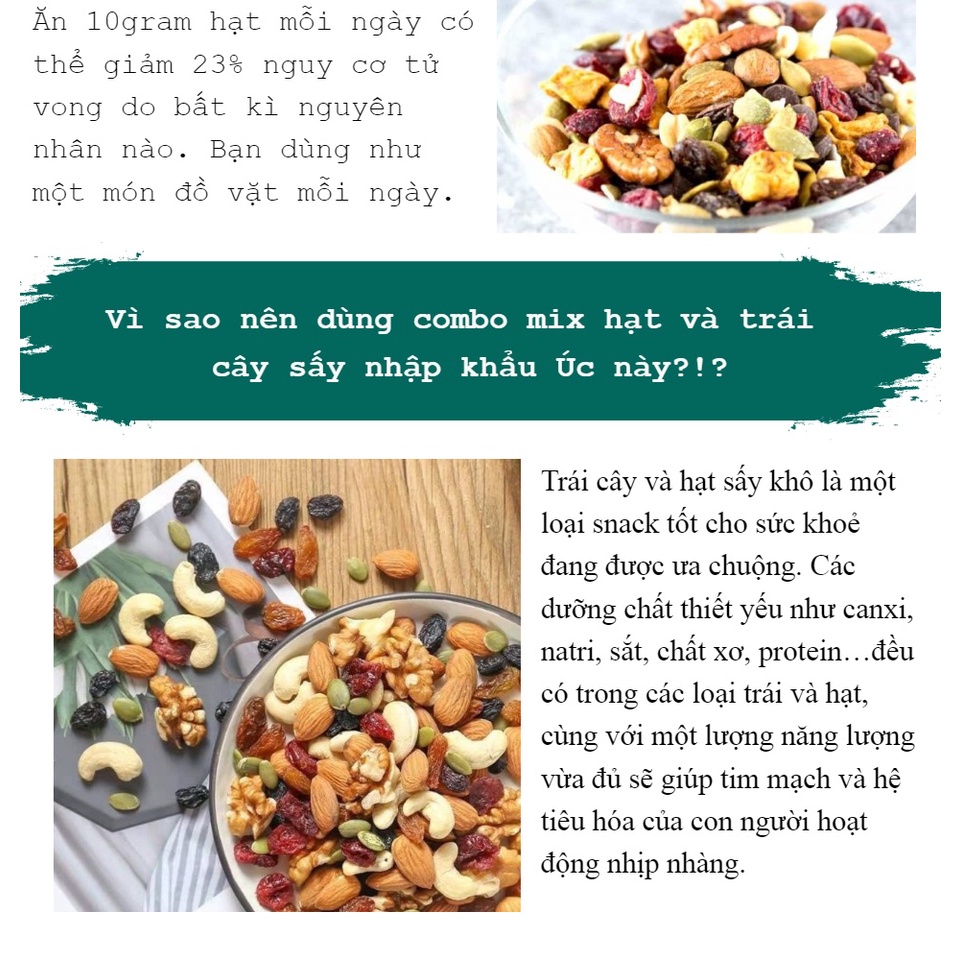 Công dụng của Hạt hỗn hợp sấy khô Mourad’s 500g Úc: - Các loại hạt trong Mourad’s 500g của Úc chứa đầy đủ hàm lượng dưỡng chất, vitamin, khoáng chất, chất xơ, chất béo có lợi, protein và vi chất, bổ sung cho cơ thể khỏe mạnh, tăng cường miễn dịch, hỗ trợ phòng ngừa bệnh tật. Hạt cung cấp năng lượng, thích hợp làm thức ăn nhẹ bổ sung, giúp bạn hoạt động hiệu quả. - Tốt cho tim mạch: Các hạt hỗn hợp Mourad’s chứa các dưỡng chất giúp tim khỏe mạnh, làm giảm lượng cholesterol trong máu, phòng ngừa xơ cứng động mạch, điều hòa và ổn định huyết áp, làm giảm các bệnh lý liên quan đến tim mạch, đột quỵ. - Giảm nguy cơ mắc ung thư: Hạt chứa chất chống oxy hóa tự nhiên, giúp ngăn cản sự tấn công của gốc tự do, làm giảm nguy cơ mắc ung thư. - Tốt cho tiêu hóa: Hàm lượng chất xơ dồi dào giúp nhuận tràng, thúc đẩy tiêu hóa tốt, đào thải độc tố trong đường ruột,giúp hấp thụ tốt hơn. - Tốt cho bà bầu: Các loại hạt rất tốt cho bà bầu, là bữa ăn nhẹ lành mạnh và khoa học, chúng cung cấp dưỡng chất nuôi dưỡng mẹ và bé toàn diện, đồng thời giúp ngừa táo bón trong thời kỳ mang thai. Hạt trong Mourad’s của Úc chứa Omega-3 tốt cho trí tuệ của bé. - Là thực phẩm lý tưởng cho giảm cân: Chứa nhiều chất xơ, nên khi tiêu thụ các loại hạt, bạn sẽ có cảm giác no lâu, không thèm ăn, từ đó hỗ trợ giảm cân an toàn, hiệu quả. - Nghiên cứu còn cho thấy, các loại hạt có tác dụng tăng cường sinh lý, giúp tăng khả năng thụ thai. - Các hạt hỗn hợp Mourad’s hỗ trợ làm đẹp da, giúp da căng mịn, tràn đầy sức sống, và chống lão hóa.