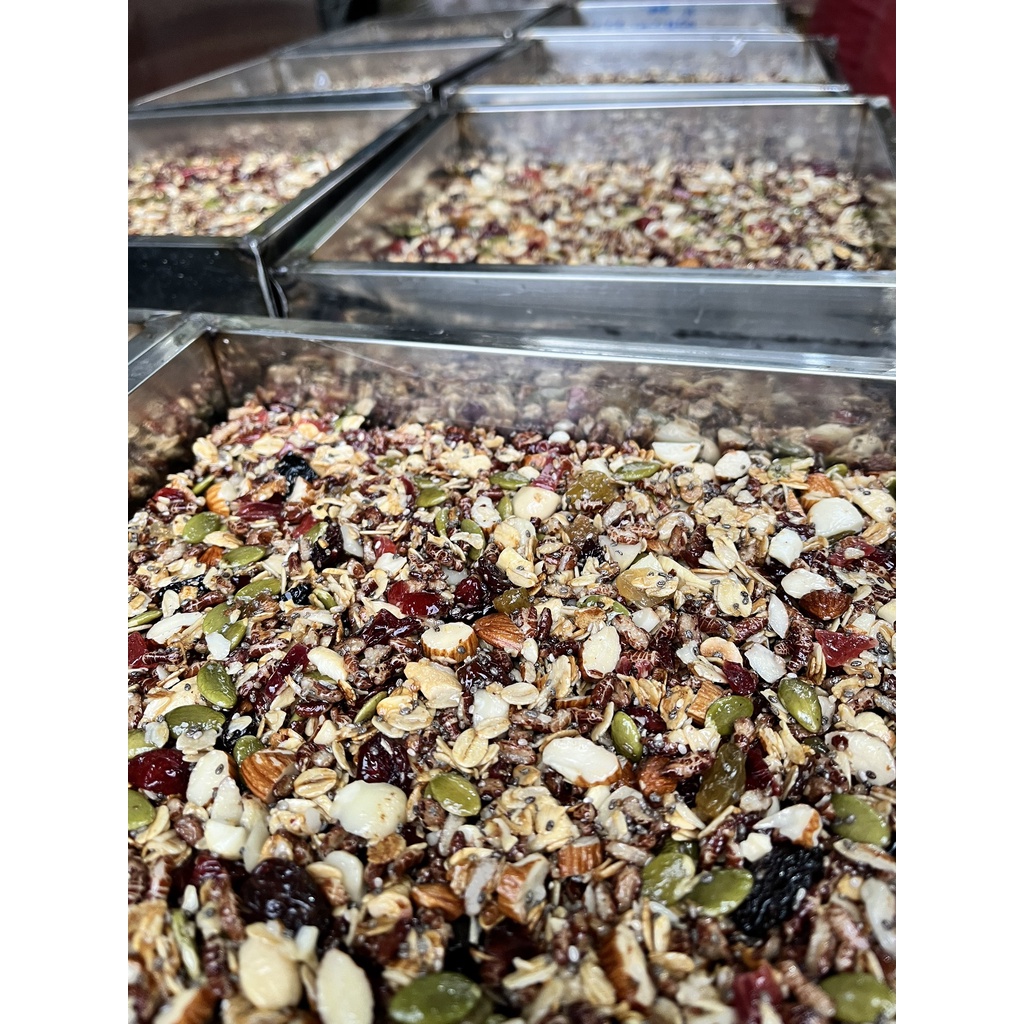 ĐẶC ĐIÊM SẢN PHẨM - Granola bar là thanh ngũ cốc được làm theo dạng thanh hình chữ nhật dùng để ăn sáng hoặc ăn vặt, có tác dụng giảm cân cho các chị em. - Nguyên liệu xịn sò, cao cấp: Gồm các loại hạt siêu ngon và dinh dưỡng: Hạt điều, macca, hạnh nhân, nam việt quất, hạt bí Ấn Độ, hạt chia, nho Chile, Yến mạch, gạo lứt, mật ong, dầu dừa.