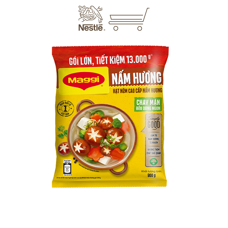 Hạt nêm Maggi nấm hương có chứa chiết xuất từ nấm hương tự nhiên hòa quyện tinh tế cùng các gia vị khác, giúp các món ăn có vị ngọt thanh, ngon miệng. Bạn có thể sử dụng để nấu các món chay, món mặn: nêm món canh, nêm món xào, tẩm ướp thực phẩ Hạt nêm Maggi nấm hương là bí quyết giúp các món rau củ, thực phẩm thêm ngon tự nhiên! ĐẶC ĐIỂM NỔI BẬT - Hạt nêm Maggi nấm hương cho món ăn vị ngọt thanh, ngon miệng - Làm từ nấm hương tự nhiên, hòa quyện tinh tế cùng các gia vị khác - Chay mặn đều dùng được THÀNH PHẦN Muối i-ốt, chất điều vị 621, đường, tinh bột sắn, dầu cọ, hương nấm giống tự nhiên và hương chay tự nhiên (có chứa cần tây, gluten lúa mì, đậu nành – contains celery, wheat gluten and soya), chất điều vị (631, 627), bột gia vị (tiêu, hành tây), bột nấm hương (nấm đông cô) 2 g** LƯU Ý - Không sử dụng cho người dị ứng với các thành phần của sản phẩm HƯỚNG DẪN SỬ DỤNG - Nấu món ngon thanh nhẹ với hạt nêm Maggi nấm hương: + Nêm cho món canh: 10g (2 muỗng cà phê) cho 1 lít nước (4 chén) + Nêm cho món xào: 10g (2 muỗng cà phê) cho 600g rau củ + Ướp: 5g (1 muỗng cà phê) cho 500g thực phẩm + Món khác: gia giảm tùy theo khẩu vị CÁCH BẢO QUẢN - Bảo quản sản phẩm nơi khô ráo, tránh ẩm ướt Xuất xứ: Thụy Sỹ Nơi sản xuất: Việt Nam Ngày sản xuất: In trên bao bì sản phẩm Hạn sử dụng: 12 tháng kể từ ngày sản xuất THÔNG TIN THƯƠNG HIỆU Nestlé là tập đoàn thực phẩm, dinh dưỡng và thức uống lớn trên thế giới với bề dày lịch sử hơn 150 năm kinh nghiệm không ngừng cải tiến và phát triển. Với hơn 2000 nhãn hiệu khác nhau, từ các thương hiệu biểu tượng toàn cầu cho đến các thương hiệu địa phương được yêu thích, mục đích của Nestlé là nâng cao chất lượng cuộc sống và góp phần vào một tương lai khỏe mạnh hơn.Giá sản phẩm trên Tiki đã bao gồm thuế theo luật hiện hành. Bên cạnh đó, tuỳ vào loại sản phẩm, hình thức và địa chỉ giao hàng mà có thể phát sinh thêm chi phí khác như phí vận chuyển, phụ phí hàng cồng kềnh, thuế nhập khẩu (đối với đơn hàng giao từ nước ngoài có giá trị trên 1 triệu đồng).....