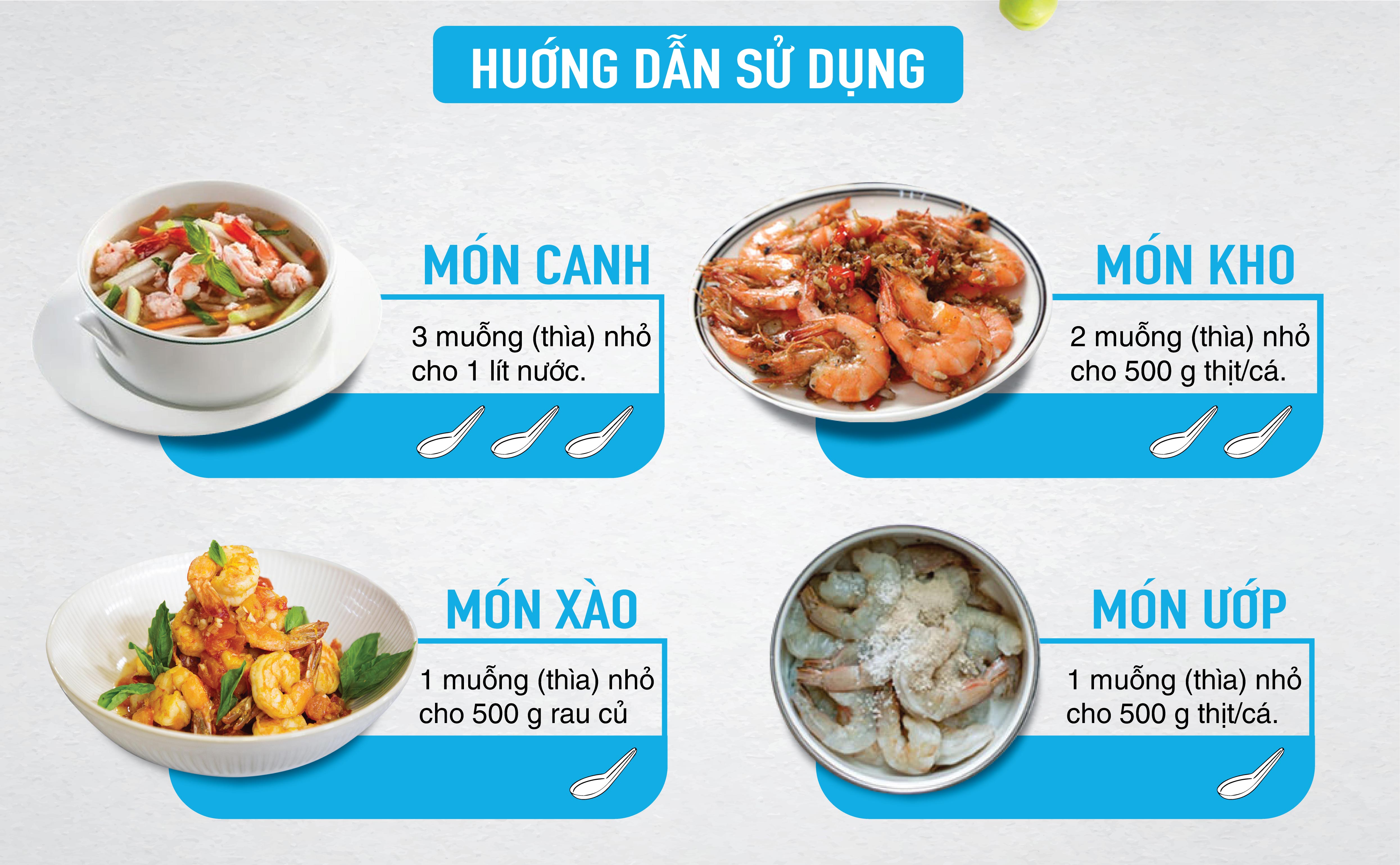 Hướng dẫn sử dụng | - Món canh: 3 muỗng cho 1 lít nước- Món chiên: 1 muỗng cho 500g nguyên liệu- Món xào: 1 muỗng cho 500g nguyên liệu- Món kho: 2 muỗng cho 500g nguyên liệuLưu ý: Mỗi muỗng tương đương với 5g hạt nêm. |