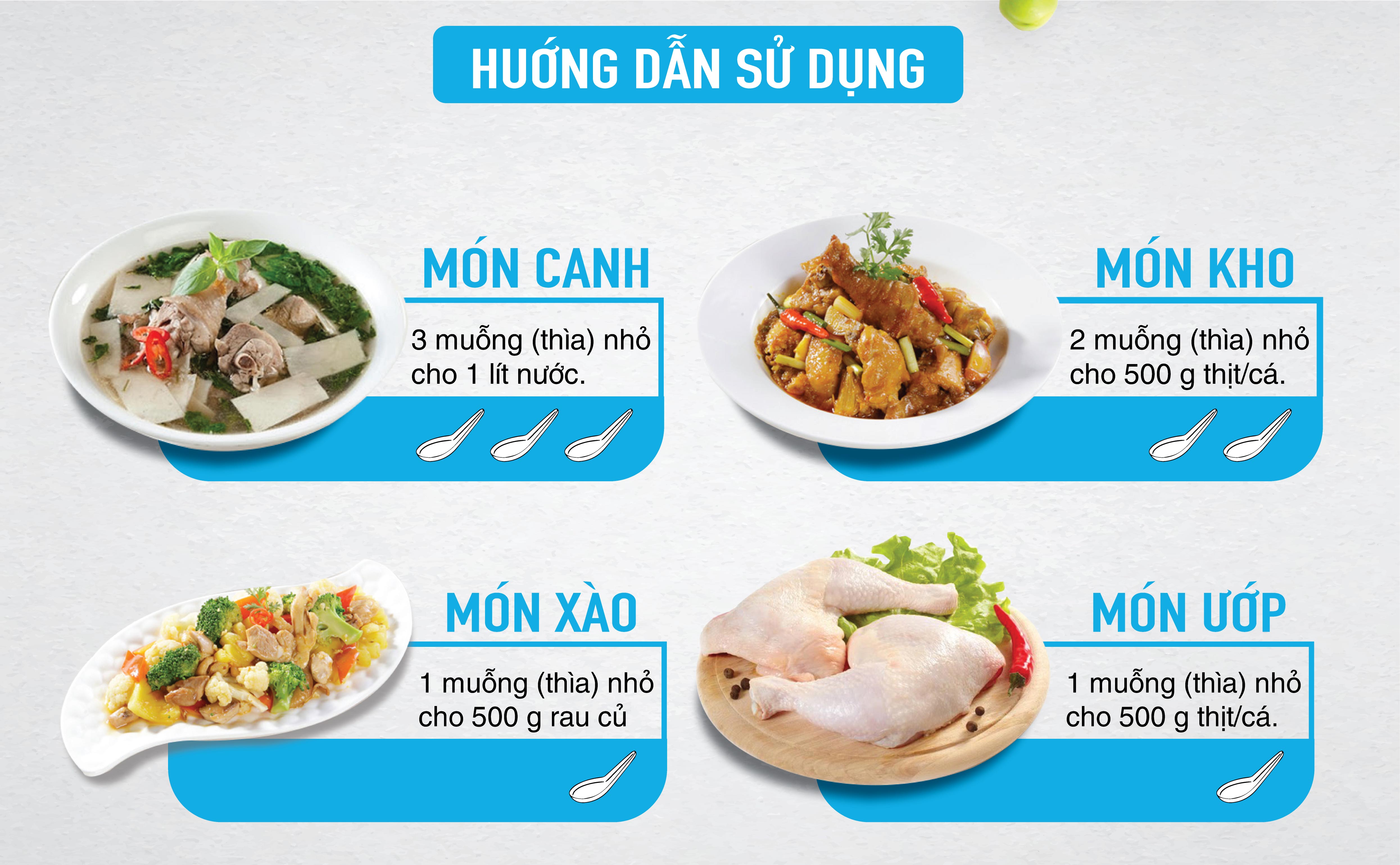 Hướng dẫn sử dụng | - Món canh: 3 muỗng cho 1 lít nước;- Món chiên: 1 muỗng cho 500g nguyên liệu;- Món xào: 1 muỗng cho 500g nguyên liệu;- Món kho: 2 muỗng cho 500g nguyên liệu.Lưu ý: Mỗi muỗng tương đương với 5g hạt nêm. |