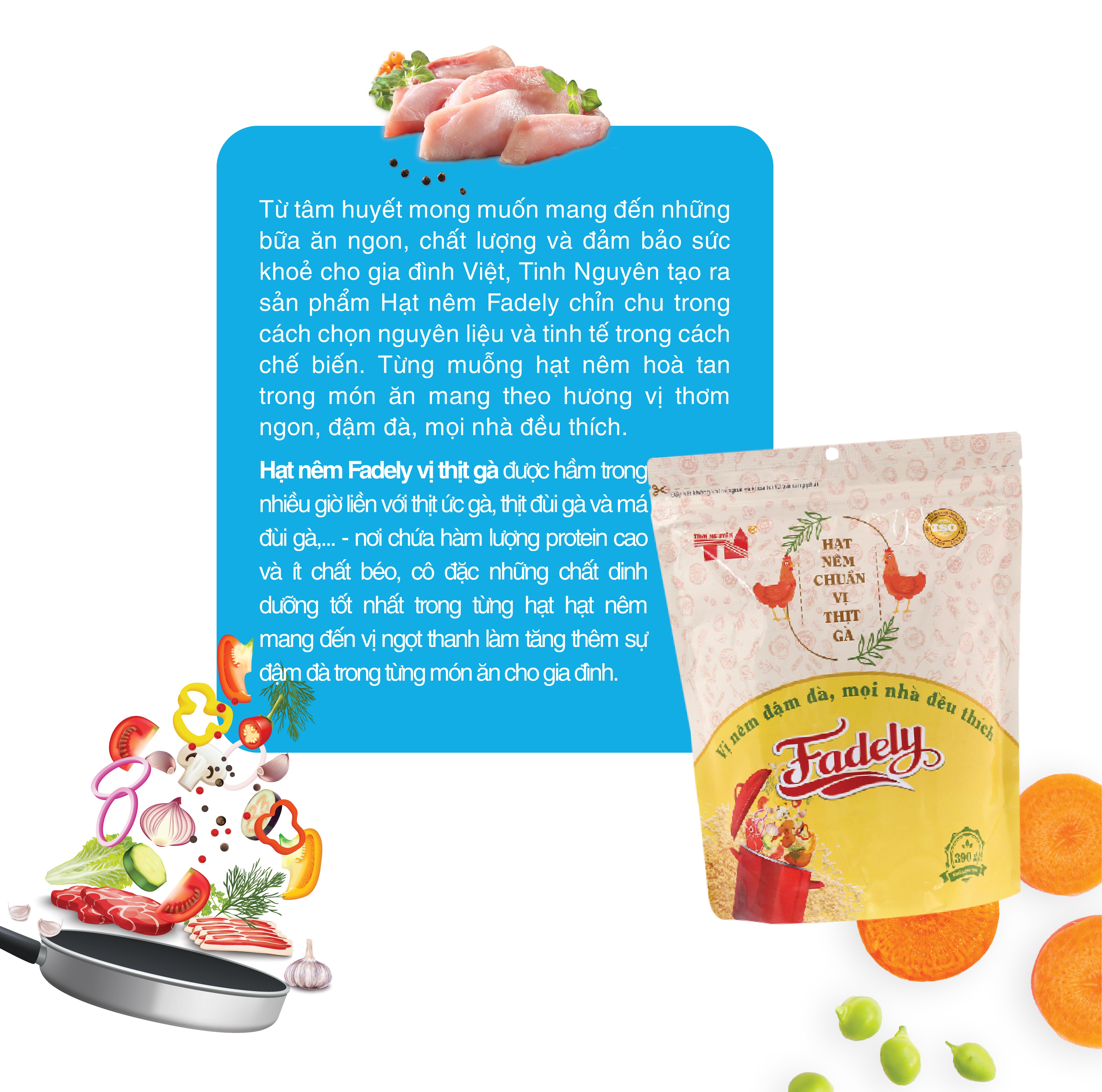 Hạt nêm Fadely vị thịt gà được hầm trong nhiều giờ liền với thịt ức gà, thịt đùi gà và má đùi gà,... - nơi chứa hàm lượng protein cao và ít chất béo, cô đặc những chất dinh dưỡng tốt nhất trong từng hạt hạt nêm mang đến vị ngọt thanh làm tăng thêm sự đậm đà trong từng món ăn cho gia đình.