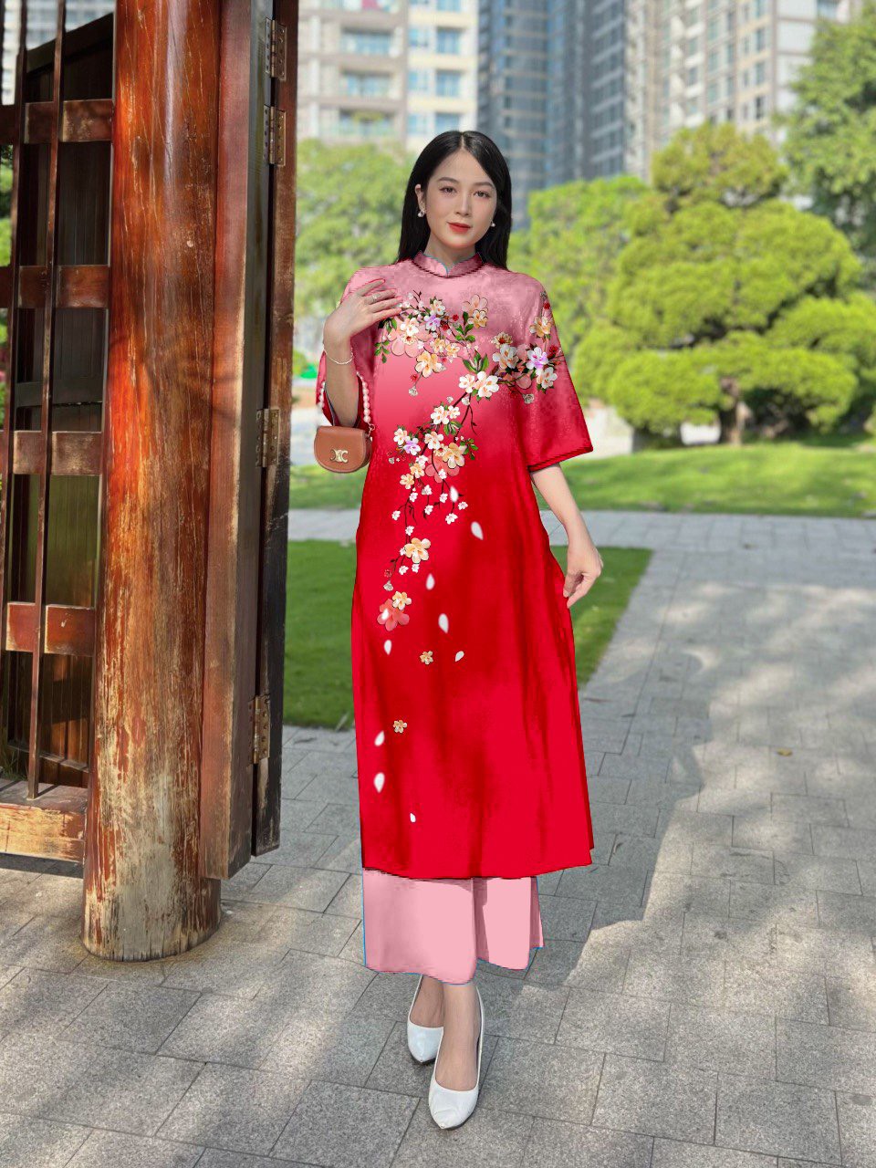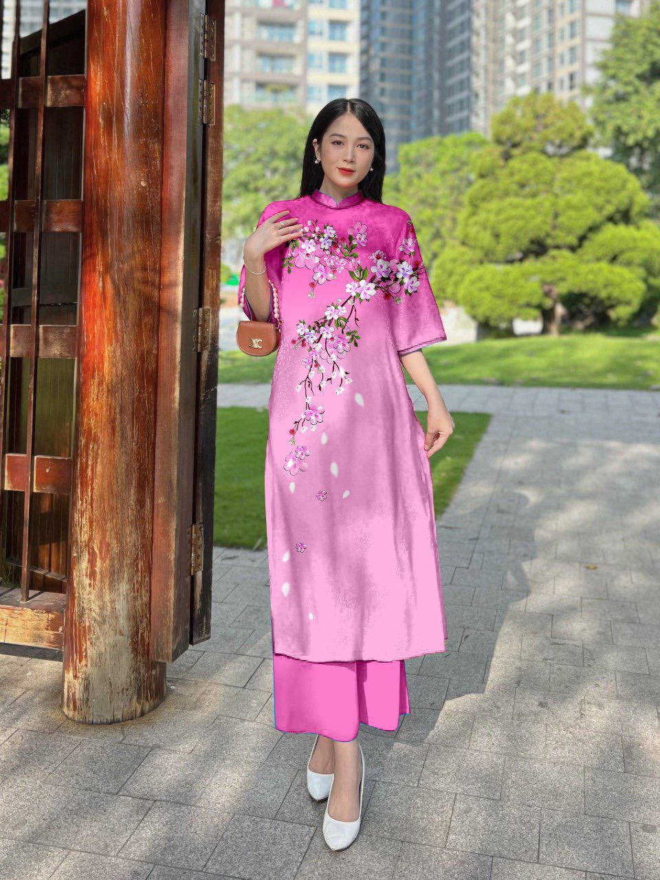 Áo dài cổ trụ from rộng gấm in hoa loang màu dành cho nữ AD046 là trang phục truyền thống của Việt Nam được yêu thích bởi sự thanh lịch và tinh tế.
