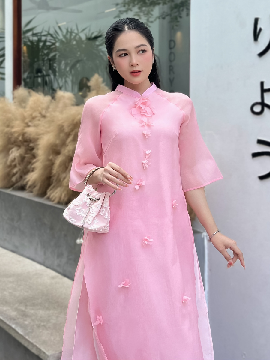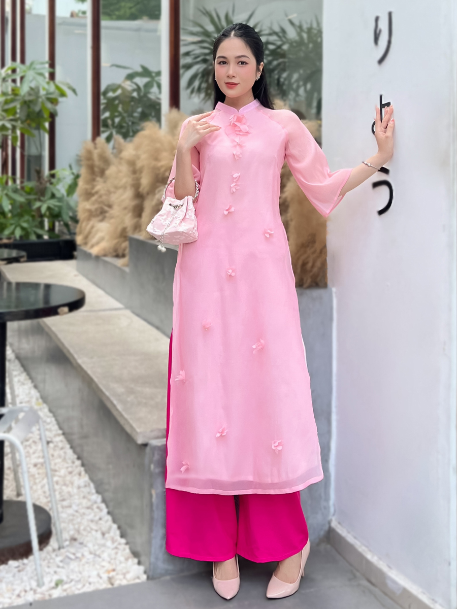 Áo dài voan tơ cổ trụ dáng suông gắn hoa 3D cho phái nữ AD043 là trang phục truyền thống của Việt Nam với thiết kế cổ trụ, tay loe rộng và Được gắn hoa cắt 3D Độc Đáo.