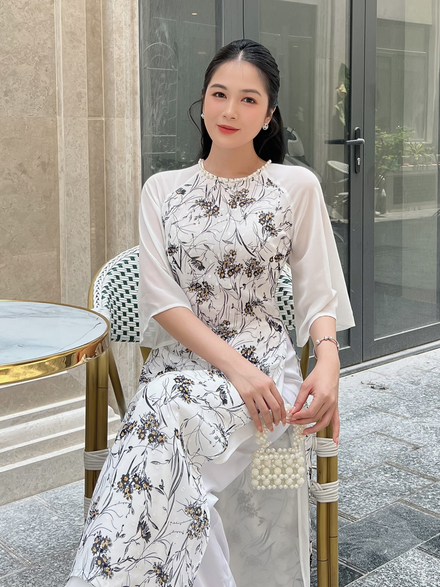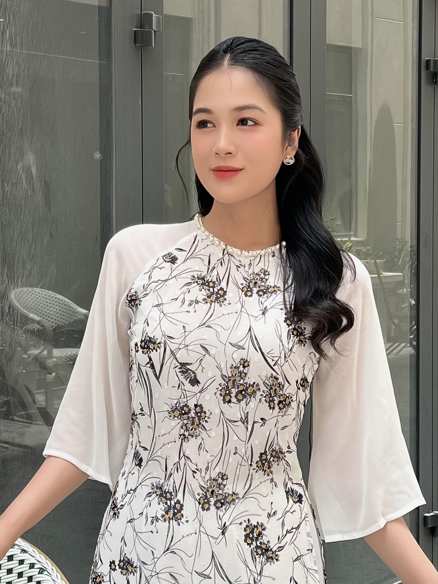 Đặc biệt với cổ đính ngọc trai chắc chắn, áo dài này tỏa sáng và làm nổi bật vẻ đẹp quý phái của người mặc.