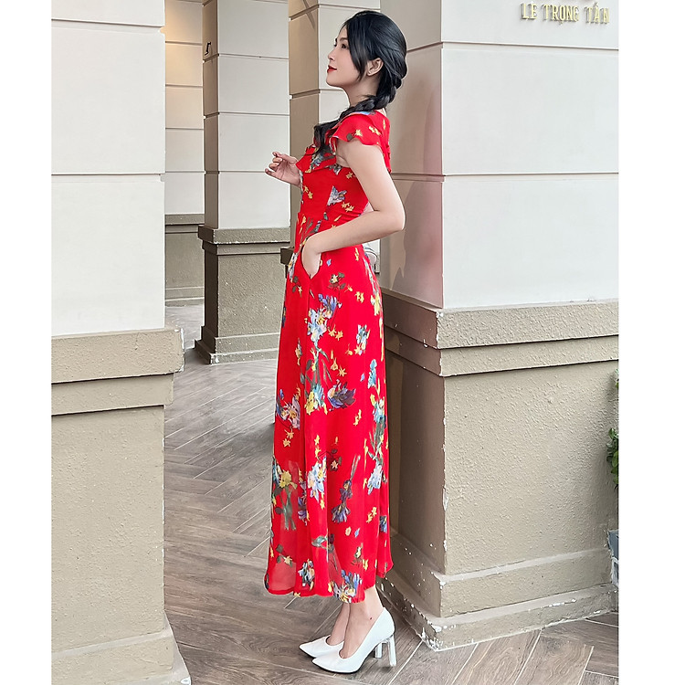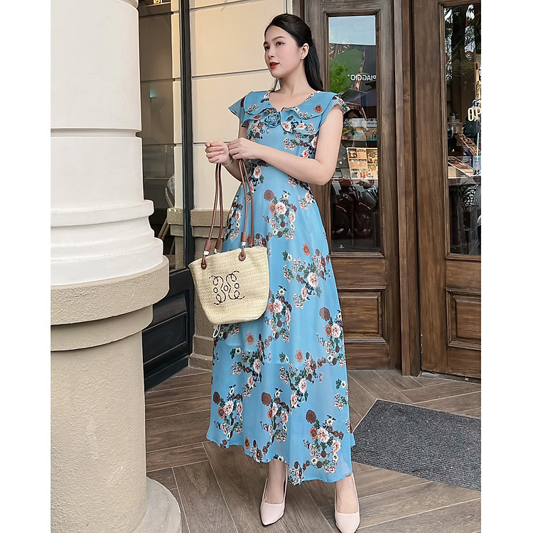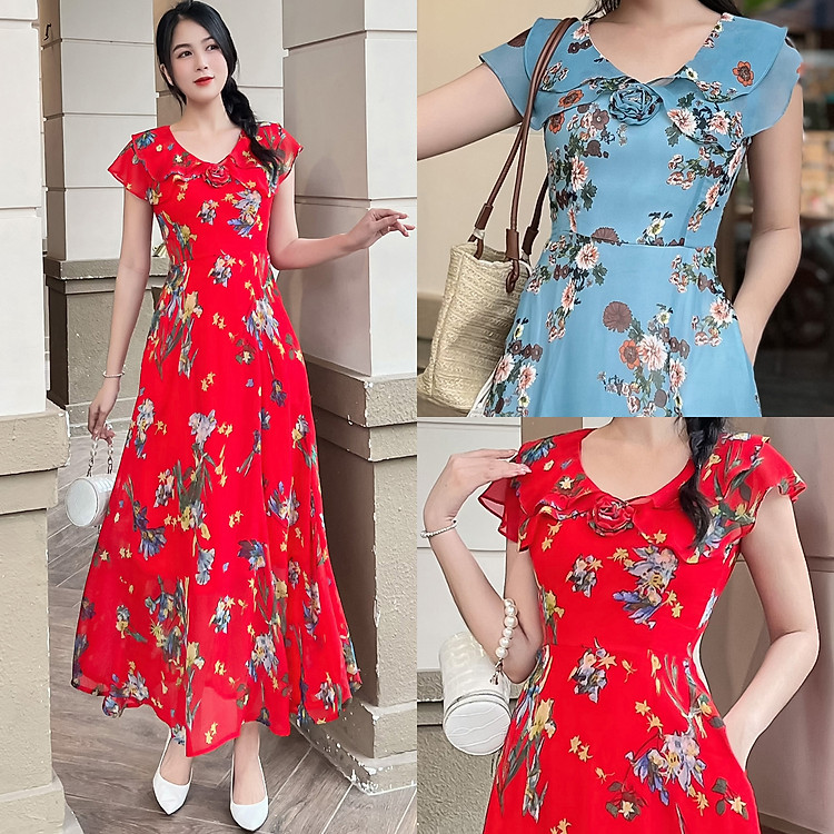 [HCM] Đầm maxi vol hoa 4 lá cổ D092 - Lady Fashion- Khánh Linh Style