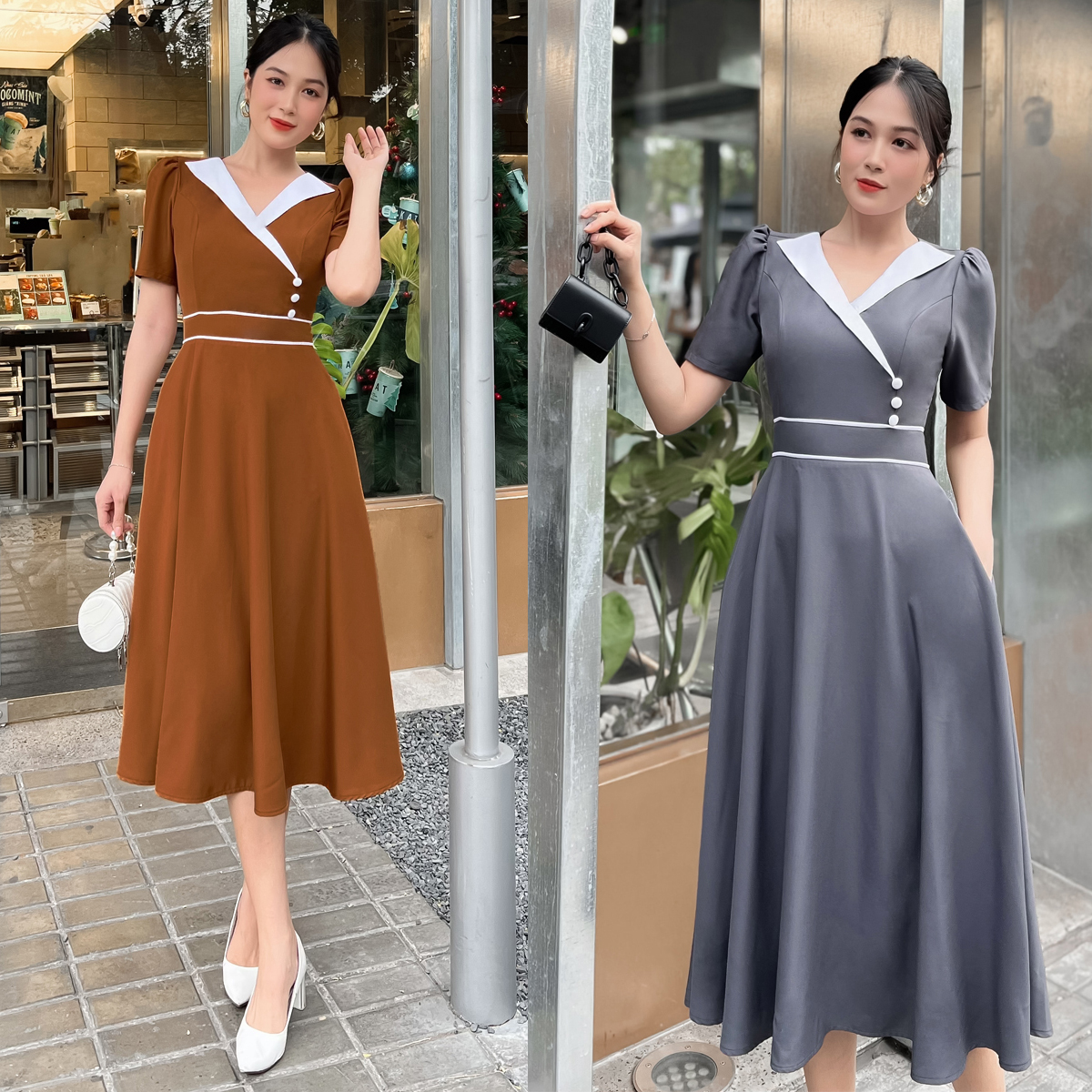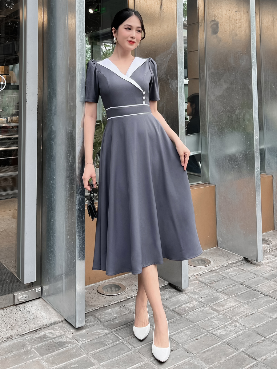[HCM] Đầm xòe cổ phối trắng thanh lịch D107 - Khánh Linh Style