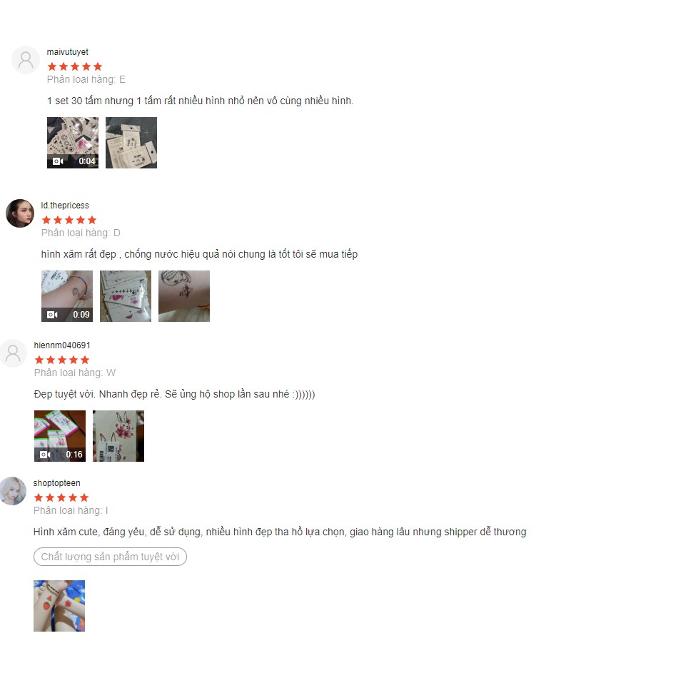 THÔNG TIN SẢN PHẨM Muốn đẹp mà sợ đau. Nhìn ngta chụp ảnh với những hình săm nho nhỏ yêu thế chứ. Thèm lắm mà chưa đủ can đảm để làm. May có set dán hình săm này thấy yêu. Dán đơn giản lắm. Tí tẹo là có ngay hình săn ưng í Miếng dán hình xăm dành cho cho các chị em yêu thích hình xăm nhỏ nhỏ xinh xinh nhưng lại ngại xăm hình thật với vô vàn lý do ….. - Cách sử dụng : cắt hình muốn xăm, rồi lột phần bảo vệ, đặt lên chỗ muốn xăm rồi dùng nước thoa lên , 1 lúc sau là hình xăm sẽ bám lên. Khi không thích có thể lau tẩy bằng sữa tắm hoặc nước tẩy trang, hoặc nước sạch thông thường. Có thể dán lên cả đồ sứ, đồ gỗ, ốp điện thoại... - Thời gian: 5-7 ngày Đơn vị nhập khẩu: Công ty TNHH THƯƠNG MẠI VÀ XUẤT NHẬP KHẨU QUỐC TẾ VĨNH PHÁT Địa chỉ: Khu 1 Đoài, thị trấn Yên Lạc, huyện Yên Lạc, tỉnh Vĩnh Phúc Xuất xứ: Trung Quốc