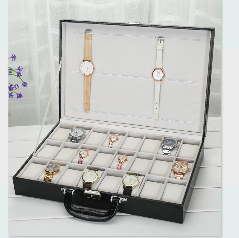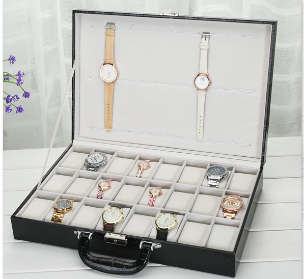 Hộp có thiết kế 1 tầng giống như một chiếc vali xách tay. Bên trong hộp được chia làm 24 ô ngăn chứa đều nhau gồm 3 hàng hàng mỗi hàng có 8 ô chứa. Ở phần trên nắp các bạn còn có thể treo thêm khoảng 12 chiếc đồng hồ nữa nhé.
