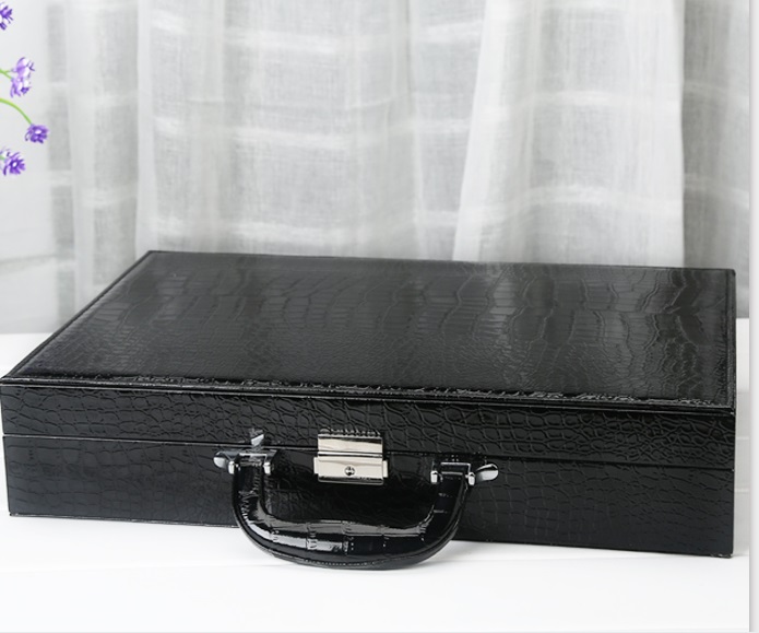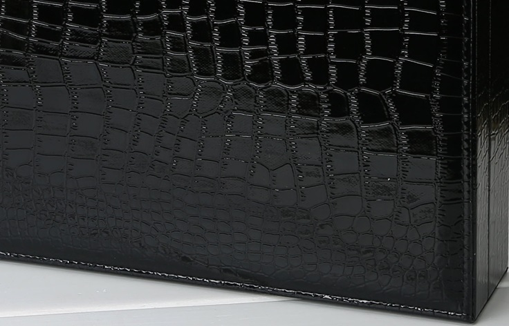 Chất liệu: Hộp được làm từ khung gỗ, bọc da simili đen họa tiết giống da cá sấu sáng bóng, dễ dàng sử dụng và lau chùi mỗi khi bụi bám.