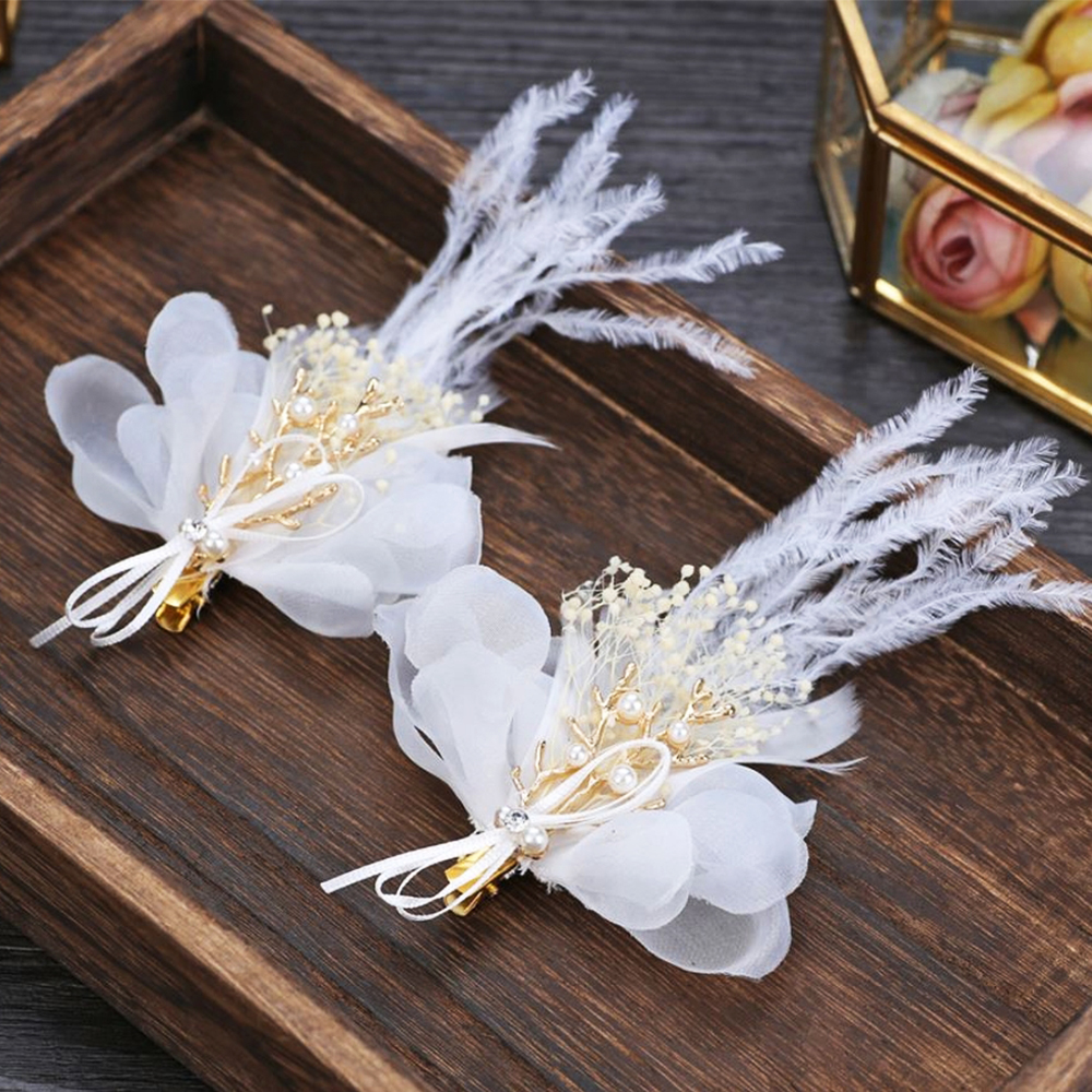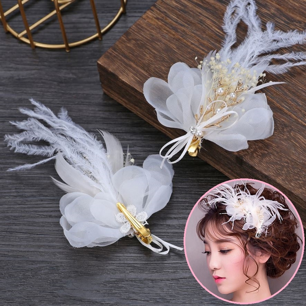 - Chất liệu: hợp kim mạ nhũ vàng, gắn hoa voan. đính đá và hạt chai mỹ ký, kết hợp lông vũ và hoa khô