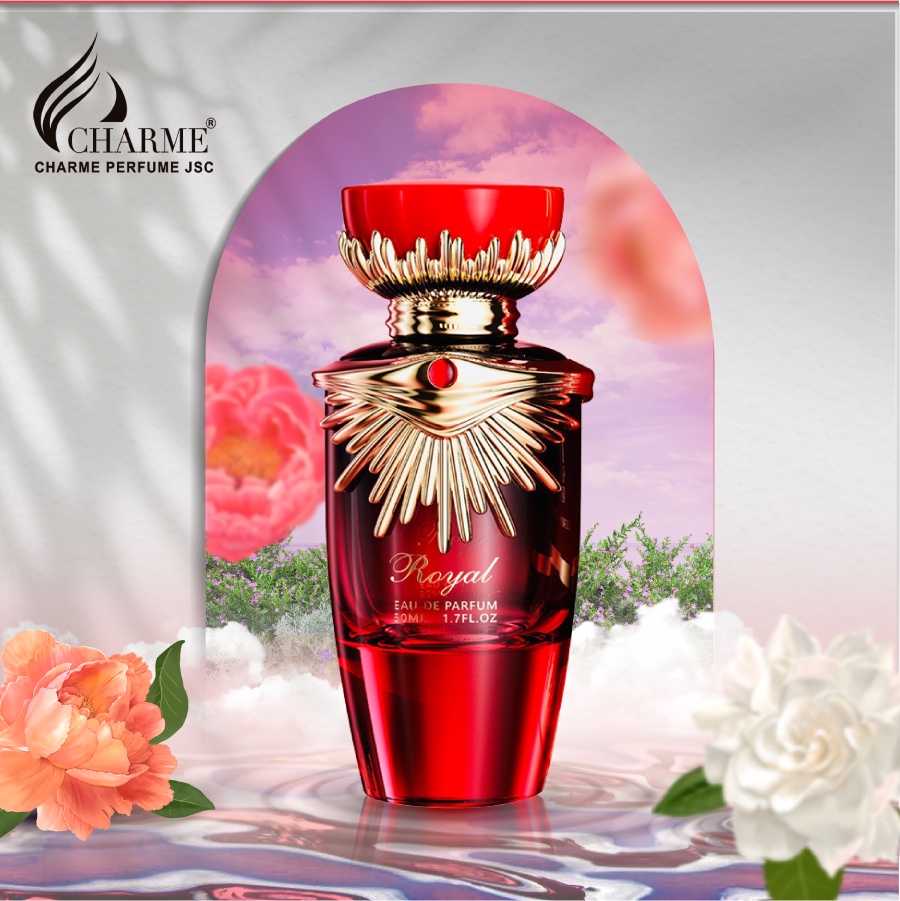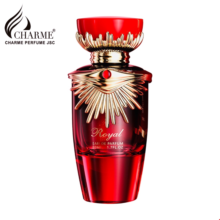 - CHARME ROYAL NƯỚC HOA PHÁP dành cho nữ với mẫu chai được thiết kế lấy ý tưởng từ một công nương của hoàng gia quý tộc, nắp chai thể hiện như đầu đội chiếc vương miệng uy nguy tráng lệ, bên cạnh đó trước ngực có một dây chuyền cang sang và quyền quý. Thân chai như khoác lên mình chiếc áo choàng màu đỏ nói lên sự quyền lực tôn vinh gá trị của hoàng tộc