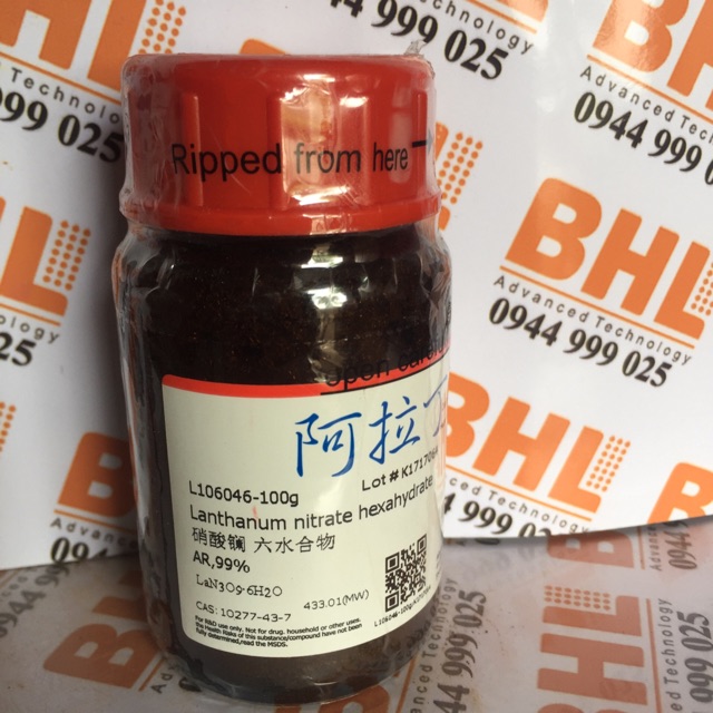 Hoá chất Lanthanum nitrate hexahydrate CAS 10277-43-7 LaN3O9·6H2O aladdin lọ 100g La(NO3)3