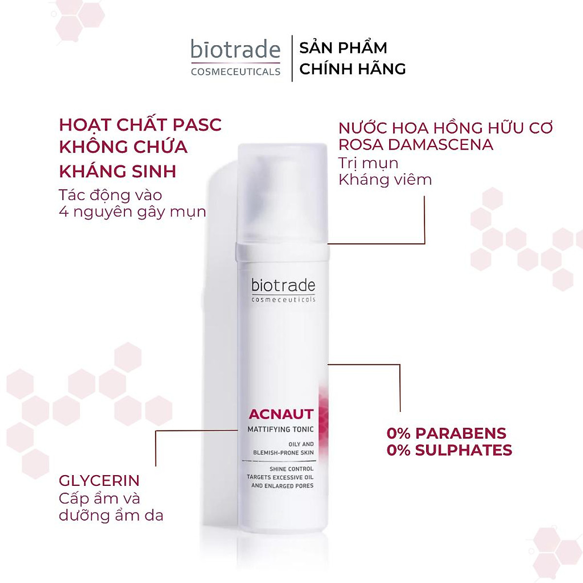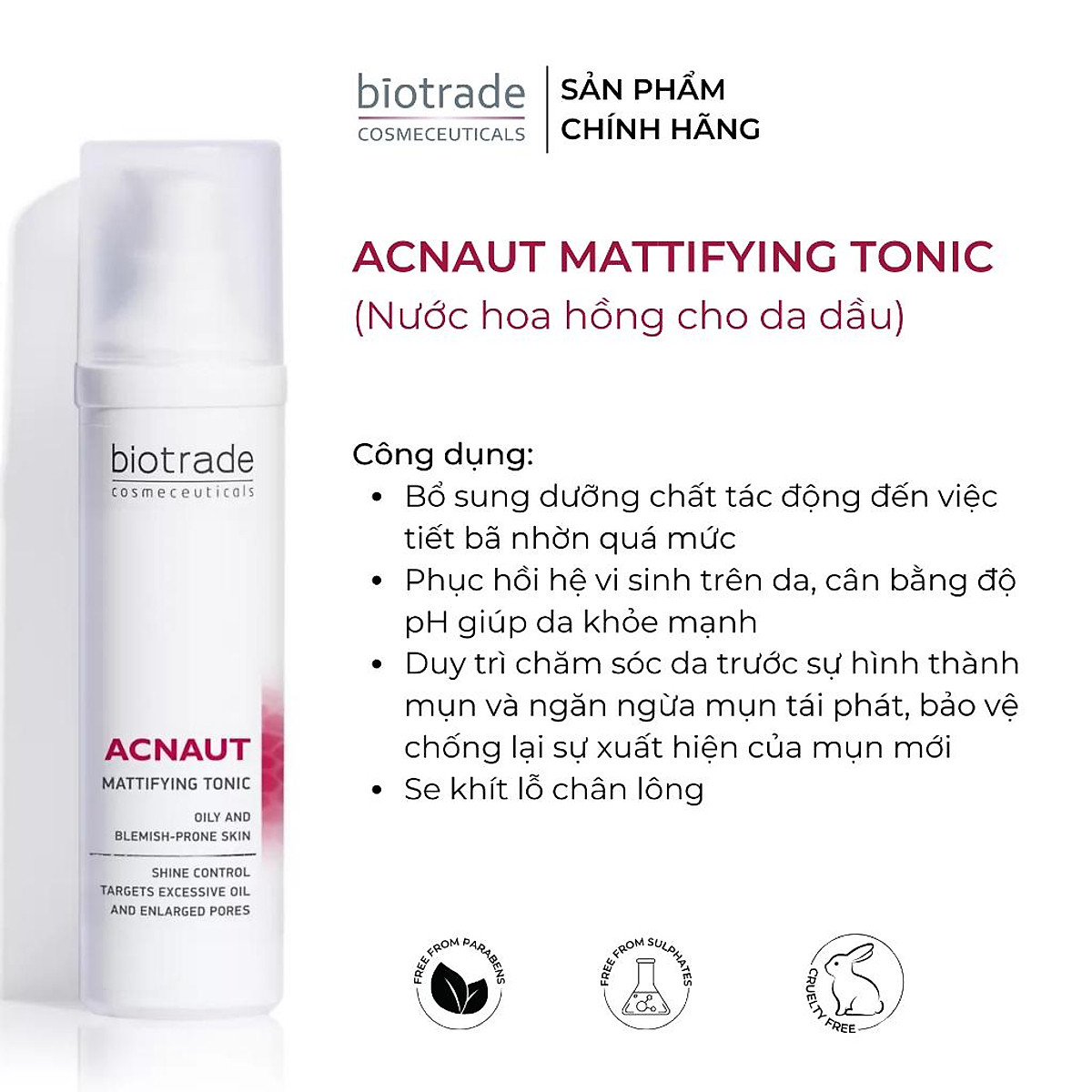 Nước Hoa Hồng Kiểm Soát Mụn Biotrade Acnaut Mattifying Tonic giúp bổ sung dưỡng chất giúp tác động hiệu quả đến việc tiết bã nhờn quá mức và ngăn ngừa tắc nghẽn lỗ chân lông. Giúp điều chỉnh lượng dầu ổn định, loại bỏ dấu hiệu đầu tiên của mụn, kiểm soát tiết bã nhờn và ngăn ngừa mụn quay lại với thành phần đỉnh cao như phức hợp độc quyền PASC, Niacinamide,Glycerin. Đặc biệt, Nước hoa hồng hữu cơ Rosa Damascena làm săn chắc và dưỡng ẩm từ đó tăng cường hydrat hóa, làm mềm và dưỡng ẩm.