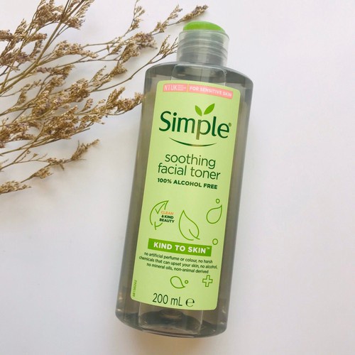 THÀNH PHẦN VÀ CÔNG DỤNG Đúng như tiêu chí của hãng này là đơn giản nên các thành phần có trong sản phẩm cũng cực kì nhẹ dịu và lành tính như: - Hoạt chất Witch Hazel từ nước cây phỉ giúp se khít lỗ chân lông tự nhiên, sát khuẩn, làm mềm và mịn da - Hoạt chất Chamomile chiết xuất từ hoa cúc giúp chống viêm và làm dịu da. - Pro-Vitamin B5 giúp da phục hồi, mềm và mịn màng. - Nước hoa hồng Simple Toner giúp loại bỏ lớp trang điểm và bụi bẩn còn sót lại sau quá trình rửa mặt, đồng thời giúp làn da được cung cấp độ ẩm tức thời, trở nhanh chóng trở về độ pH cân bằng để sẵn sàng cho các bước dưỡng tiếp theo.