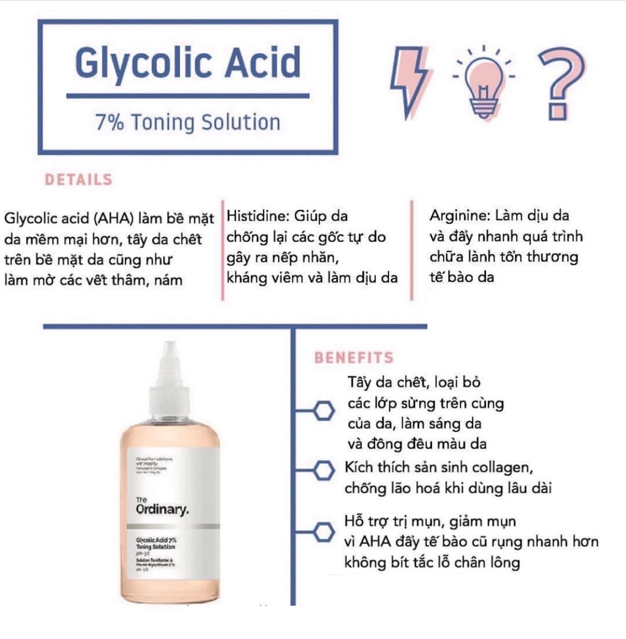 - Hỗ trợ điều trị mụn, giảm mụn vì AHA đẩy tế bào cũ rụng nhanh hơn, không bí tắc lỗ chân lông.