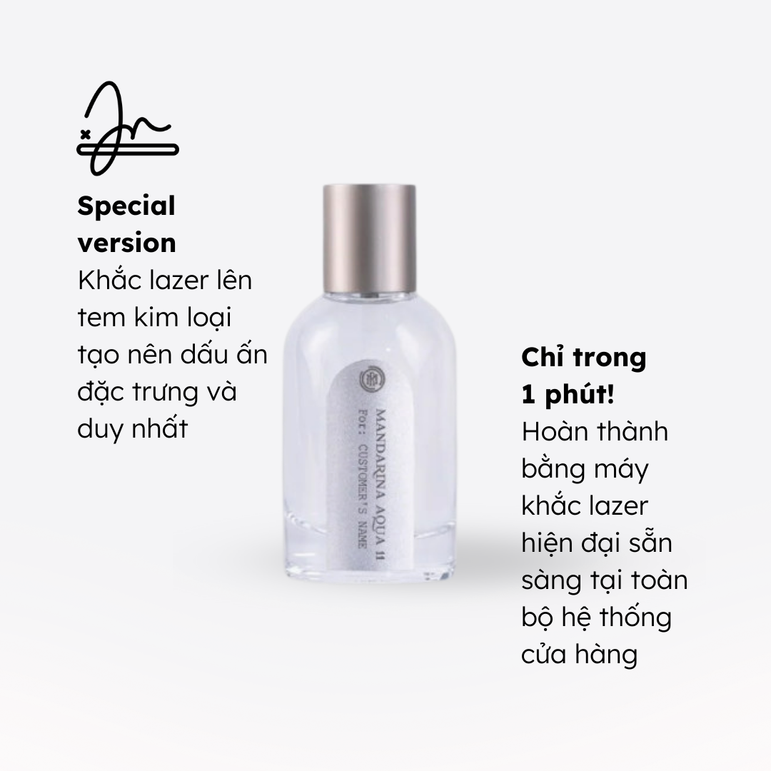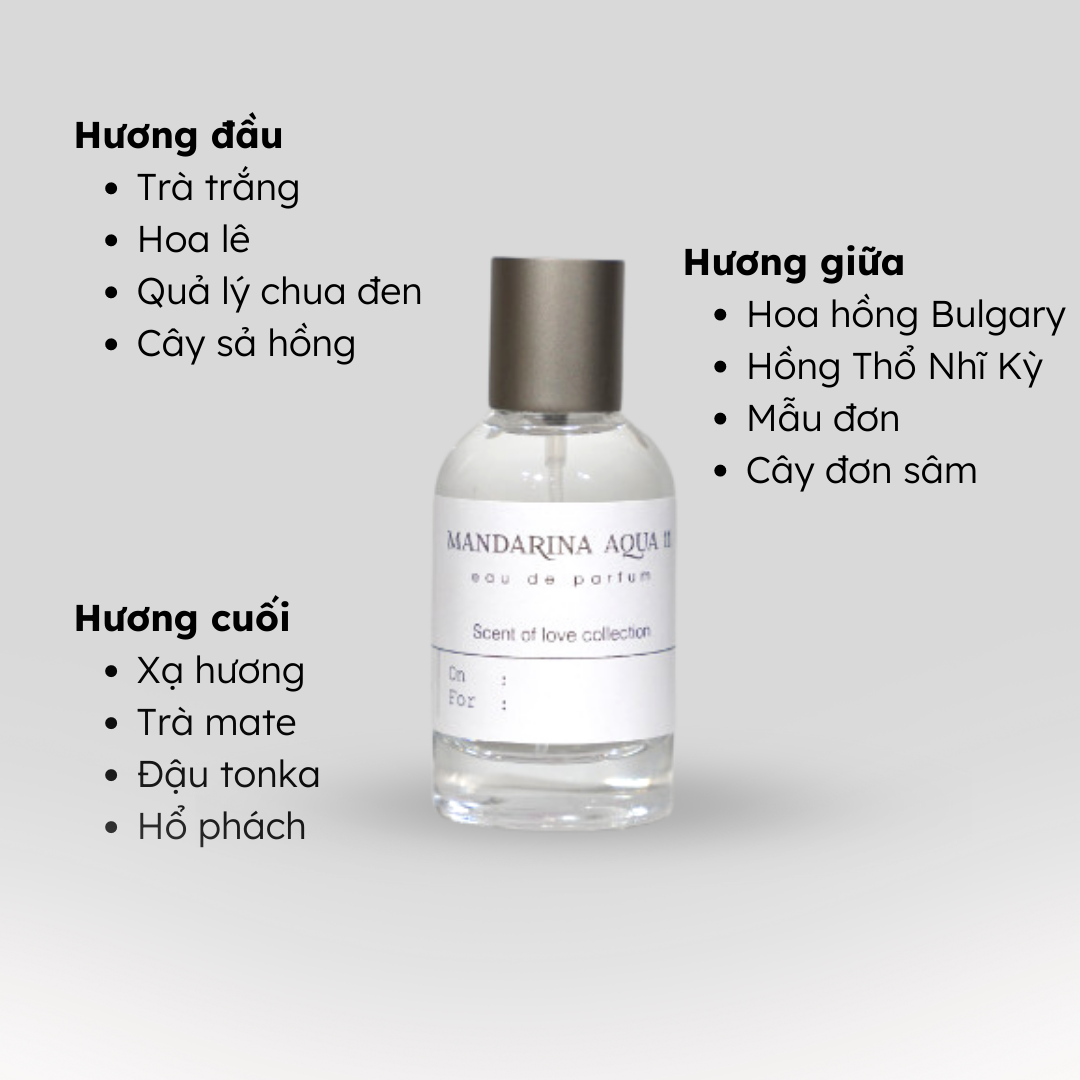 - Mandarina Aqua 11 là mùi hương của niềm vui và sự hạnh phúc tròn đầy. Như một tình yêu đang chín, Mandarina Aqua 11 khiến người sử dụng nó trở nên rạng ngời, ngọt ngào và thành thục như một đoá hoa nở rộ. Cảm xúc mà Mandarina Aqua 11 mang lại cũng là cảm xúc của yêu và thương, hy vọng và chờ đợi, ngỡ ngàng và hạnh phúc.