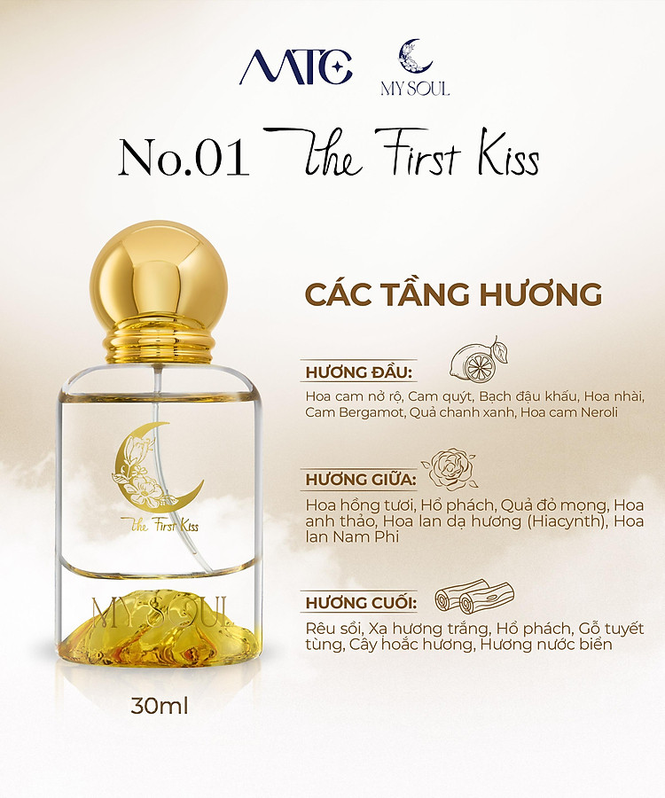 No.01 The First Kiss là dòng nước hoa đầu tiên mang Signature của Mỹ Tâm. Được lấy cảm hứng từ những cung bậc cảm xúc của nụ hôn đầu còn ngại ngùng, bỡ ngỡ. Hương thơm là sự kết hợp nồng nàn của hương cam nở rộ, cùng bạch đậu khấu, tiếp nối là sự ngọt ngào của hoa hồng tươi và nồng ấm từ hổ phách, chấm phá cuối của sự thanh mát là gỗ tuyết tùng và hương biển. Tất cả tạo nên một sự hòa quyện lướt qua từng cung bậc cảm xúc khác nhau, tựa như sự chớm nở của nụ hôn đầu ngày ấy, càng lưu luyến, càng vấn vương.